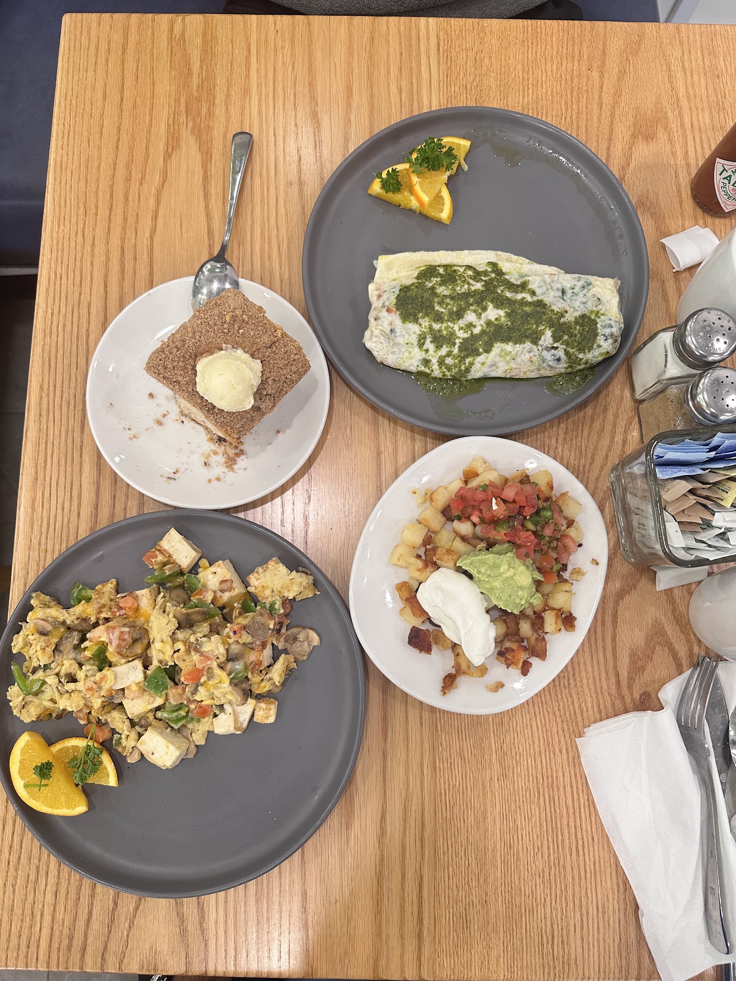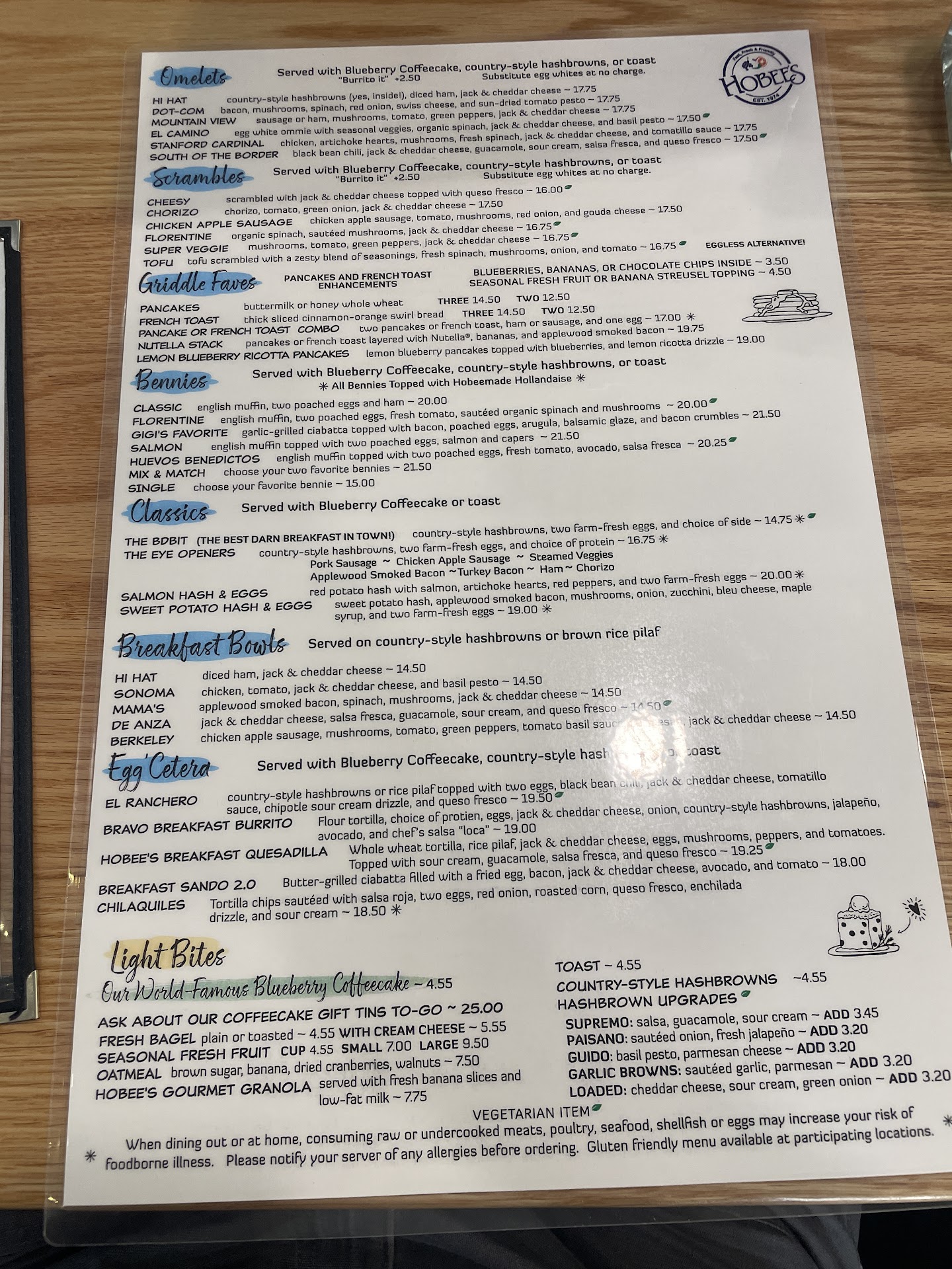 I am so disappointed in the downtown San Jose location, I only have it 3 stars because I can't give a 2 1/2 and the food is still good. We sat for over 20 minutes before anyone came to take our order (I don't know why we waited, we should have got up and left). My brother had to tell someone we were ready to order and then we still had to wait. Maybe our server was on break, okay then seat us in an active section. We watched people who arrived after us, seated in other sections, get served before us. The two tables to either side of our table were also neglected; at one point a person next to us was tired of waiting and got up to get the items the table had asked for on her own. Keep in mind they asked for these things before we sat down because no one came to our tables for over 20 minutes. There were more people working the floor than there were parties seated in the dining area. I think outside was neglected as well because people kept coming in to check on the things they had requested and ask for their checks. I miss the old locations and service. My family and I have been coming to Hobees for years. This new location does not have the same feel as the original locations and its a bit disappointing. If you are wanting that true Hobees experience, take the extra time to go to the locations in Sunnyvale or Palo Alto because the coffee cake is...