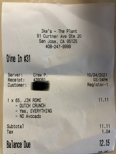 This was my second visit to Ike's, and much like the first time I walked away impressed with the quality of sandwich. When you walk in and look at the large menu hanging on the wall, you may be daunted by the large assortment of sandwiches and their corresponding names, so it may be worth your while to to check out a menu online to get an idea of what you want. The Matt Cain and Madison Bumgardner are the sandwiches ive personally tried and both hit it out of the park. #pitcherswhorake the taste is top notch and the availability of Dutch crunch as a bread option really brings it home in my opinion. Why 4 stars then? To me the sandwiches seem expensive. Expect to spend between 11 to 14 dollars for a sandwich and more if you want any of the sides offered (fries are delicious btw) and/or a drink. Also parking can be terrible as this location is in the center of the Plant. Lastly, the store closes the pretty early. Altogether though, Ike's is definitely worth a visit especially if you like sandwiches. The taste should have you coming back despite...