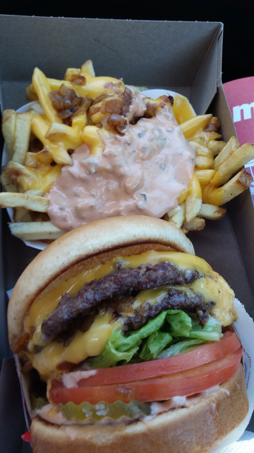 After a year of debating which hamburger joint was better “the others Guys” or “In-N-our Burger” I finally went to the dark side to see what all the hubbub was all about. As I walked up I noticed that they were very busy but the lines moved fast, the restaurant was clean and had a lot of 50 style diner photos “very cool” I ordered double cheese burger and the animal fry’s “from the secret menu” the server was all smiles, super polite and friendly. So far 5 stars all around. When my name was called I got mu food, filled my cup with lemon aid and sat ready to grub down. The burger came with onions, lettuce, tomato and a toasted bun. “liked the toasted bun” Mayonnaise and barbecue sauce is not available? I did get a very hard to open package of “what I think is” something like thousand Island dressing with relish in it. For “my” taste buds I found the burger lacking 3 stars max, The animal fries were crisp but just had cheese “and tasty stuff” on the very top, I could not pull the fries from the bottom and dip them in the topping as it was a hard clump “2 Stars.” Very disappointing. On the bottom of the cup and the French fry holder I found Bible verses “as one who is in Christ I think that is a great concept, my friend who was there with me, IS NOT in Christ, said he likes that they do that and has actually looked up the verses from time to time. 5 stars in my book” The price point is also 5 stars, over all I think 3 stars is a...