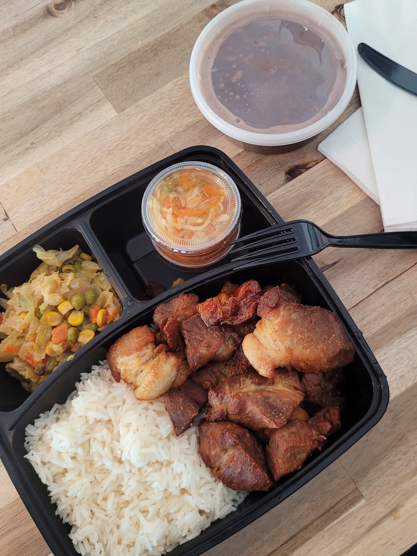 The meal was served in a plastic container with plastic utensils, and non-recyclable cups for water. I urge the owner to change that. Plastic is polluting our environment. Re-usable dishes and utensils are better for Mother Nature.