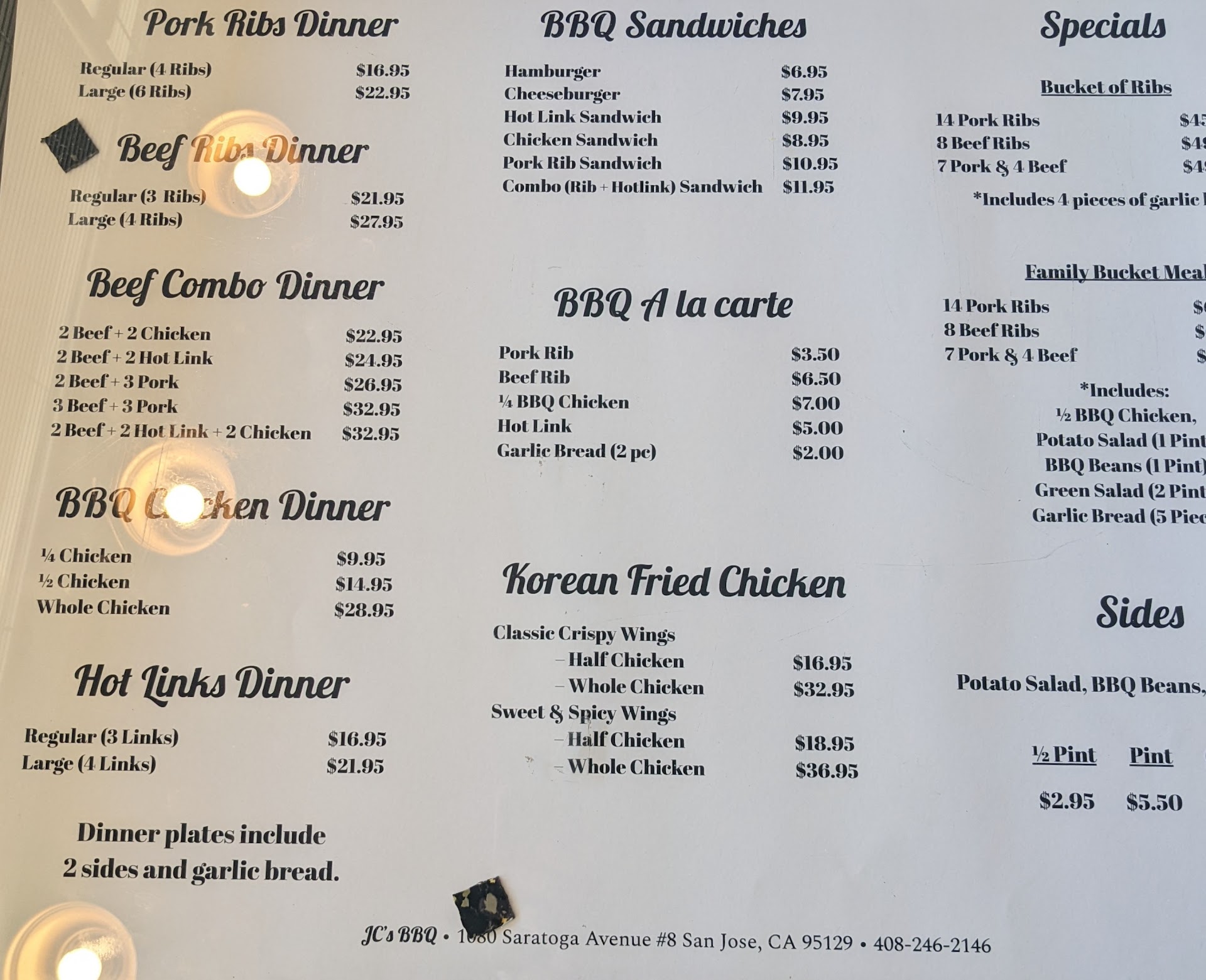 We recently went to JC's to get my daughters First Birthday Ribs. We looked up the prices on JC's website, and saw that a Beef Family Bucket meal was 52.87 and we were like "Wow! What a great deal!" So we drove to Saratoga CA to get it. When my husband got back to the car we saw that they charged us 79.99. Upon calling the gentleman that charged us says "Well I've been here for 25 years, I have no idea what the website says". We had just lost our dog so we didn't have extra money due to vet bills, the money we used for her birthday dinner was borrowed. We were expecting to be able to buy a cake and some other things after leaving JC's and instead we went home and ate our 87. Dollar dinner. I debated leaving this review because we love JC's. It's been a staple in our family for 25 YEARS+. Transparency on prices would be VERY nice. We would have waited to get it til we had the extra money. Update your website prices. Please. And don't be so nonchalant when customers call to ask why it's so much more expensive. If we could do her first birthday over again. We would. And the potato salad wasn't even filled...