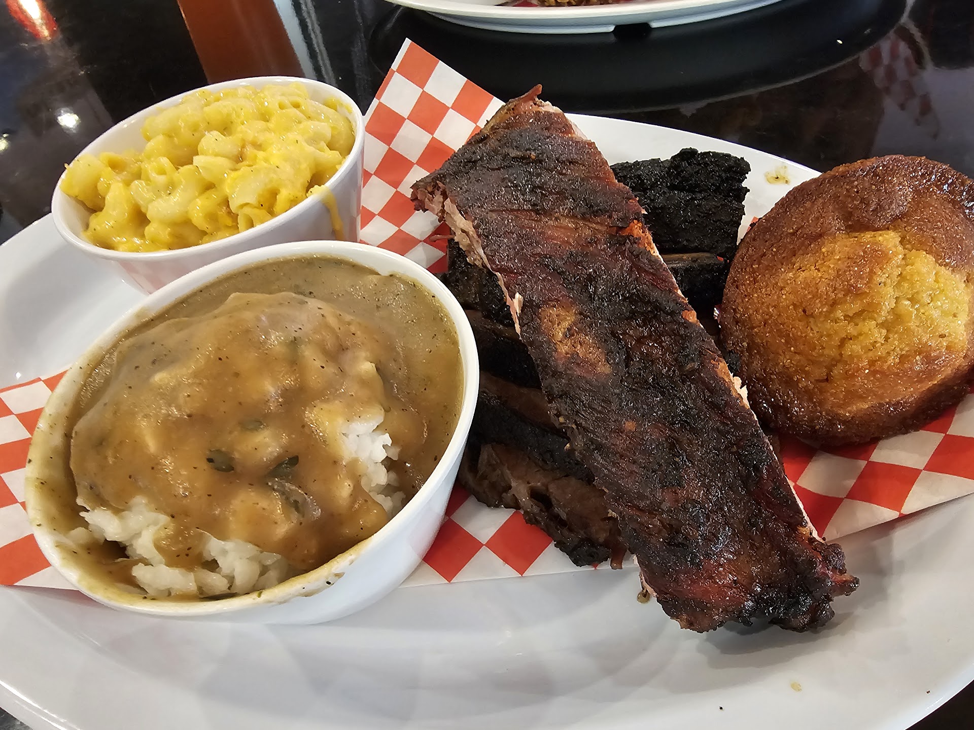 The sides were really good. Mac and cheese was fluffy and the cheese flavor really comes through. The gravy and rice were simple but I really enjoyed it, had almost a cauliflower/mashed potatoe texture vibe to it. The red beans were good and not a bbq bean like we thought, really good. Your plate comes with a piece of corn bread which I thought was dry at first, but as you keep chewing realize that it is almost cake like. Nicely done!