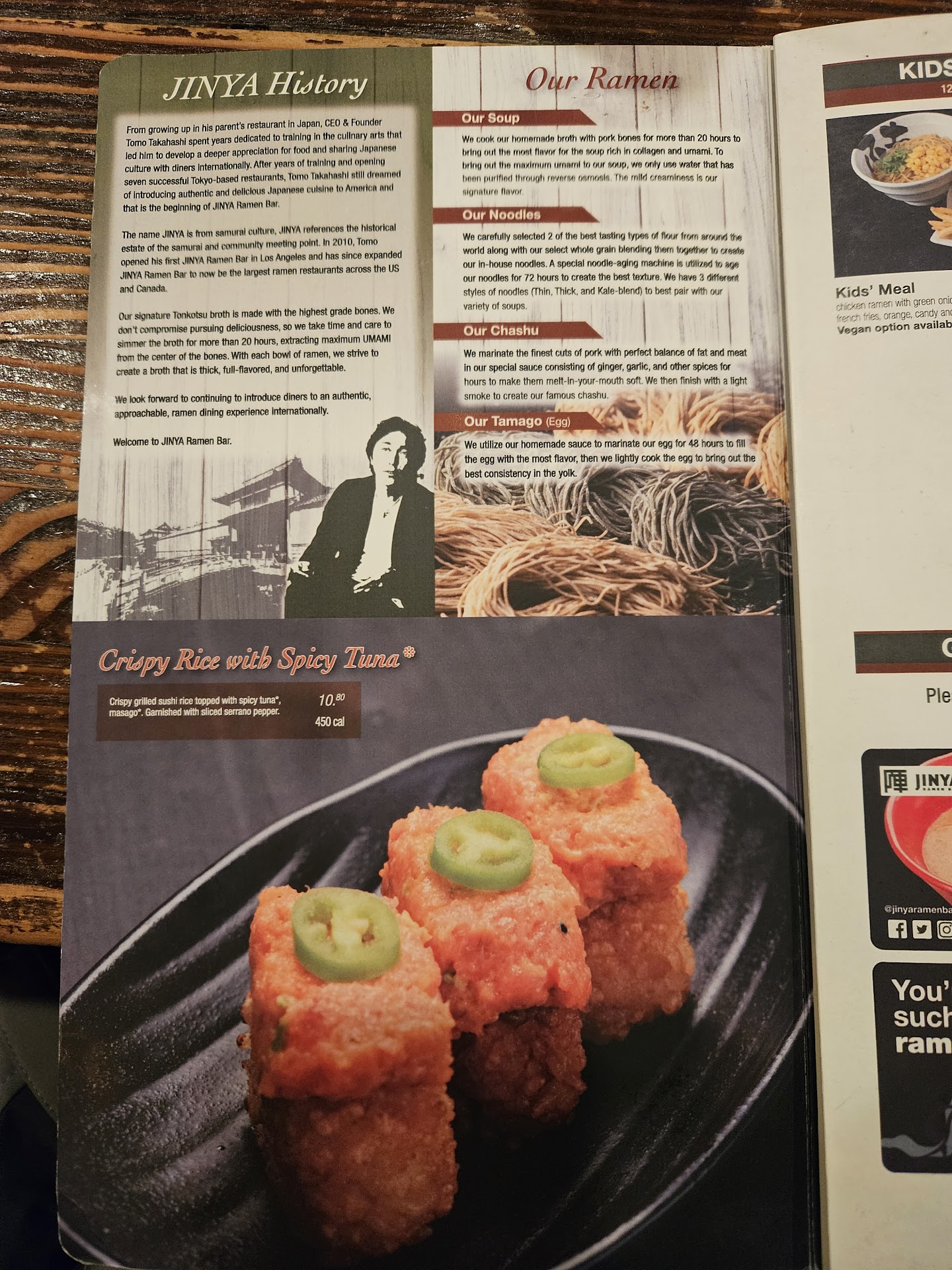 Read moreWhat can I say about Jinya other than its my favorite ramen place. For me, no other ramen place has matched up to Jinya until now. Jinya at San Jose has a good patio seating with a table fire and ceiling heaters. These made the seating comfortable for when we were there a few days ago on a cold California night. The food, being hot and spicy, kept the cold at bay. Spiciness, of course, is as you want it. Mild, medium, spicy, and hot. If want spicier than hot, do ask your waiter for the extra spice if it's not already there at your table. The food quantity and quality as usual was a chef's kiss. I am still lamenting about the fact that they stopped the spicy edamame. I wish they bring it back on the menu. The regular edamame, even though good, doesn't match up to the spicy edamame that they had a few years ago. Overall, you won't be disappointed with Jinya. Its always been a definite revisit for me if I'm eating at the restaurant. Take out is kind of iffy. I like the ramen hot. Take out neans cooled down food, which even upon reheating isn't that great. So I recommend eating at the restaurant, if you are...
