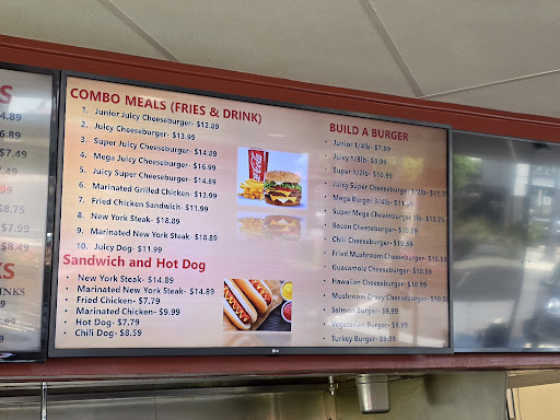 Read moreI really wish there were half stars as I'd give this place a 4.5. The store is easy to see from the street but parking can be a little lackluster as it shares a small lot with 3 other businesses. Inside, it was clean and simple. Nothing extravagant. A good number of tables and chairs, and a station to both throw your food away, put away your trays and get your napkins, straws, etc. The menu was pretty standard, a variety of burgers, fries and to my surprise hot dogs. The burgers are cooked to order, and are served "plain". Once you receive your burger you are given control of your toppings. Shredded Lettuce, romaine, mustard, ketchup, BBQ sauce, tomatoes, pickles, you name it. There were even toppings for the aforementioned hot dogs. After you've built your burger, it is time to out the beef to the test. I found my burger to live up quite well to the juicy moniker. It was delicious and the cheese was great as well. I'm sure it was real cheese and not the fake stuff you find on fast food burgers. I did also get the fries, but they were nothing to write home about. All in all you can expect a great burger from Juicy Burger at a price that is a couple dollars more per person than you would at most fast food spots. Definitely give this place a try if you're a...