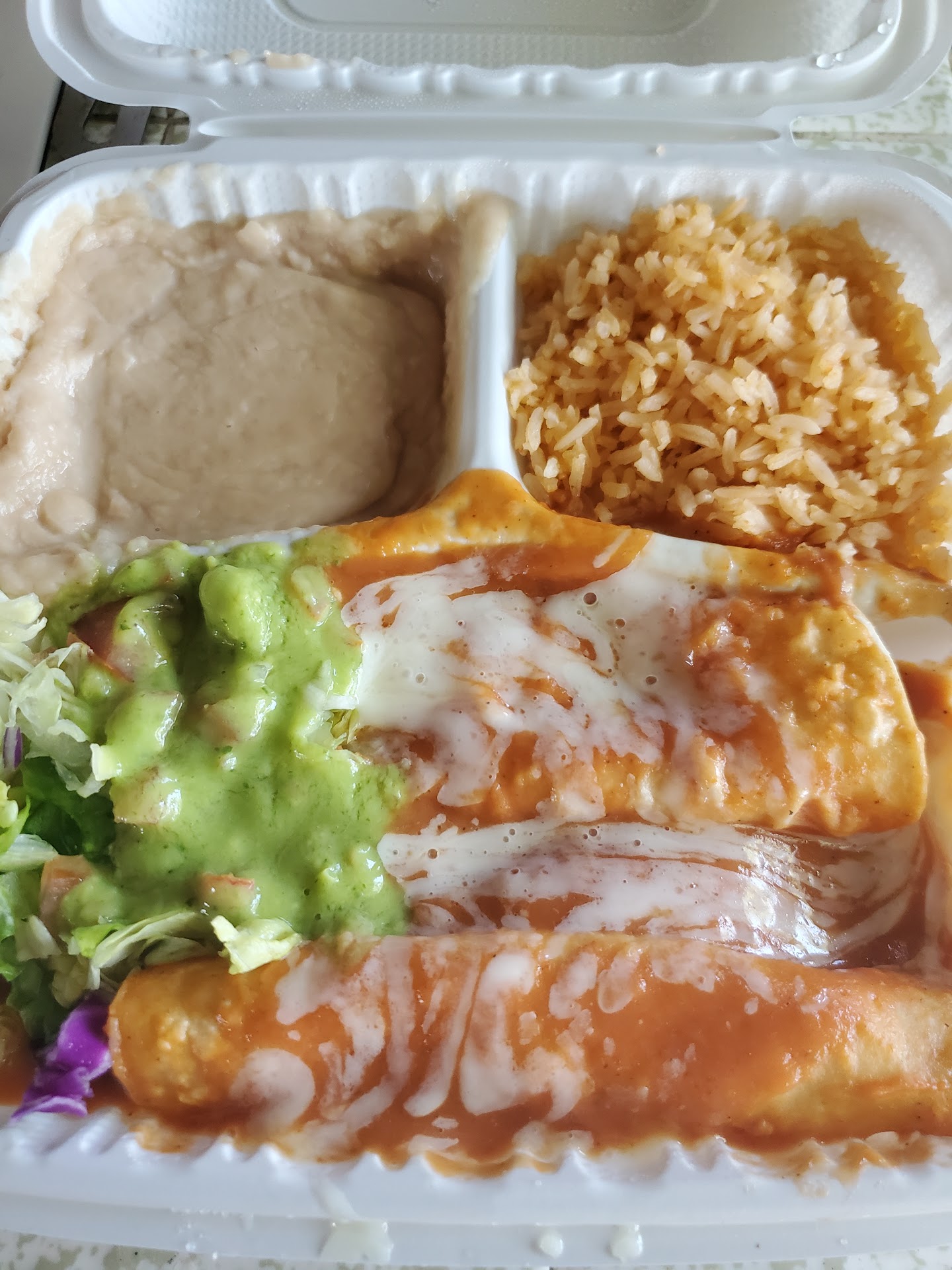But this is really about the food. I am astonished at the lack of flavor. The chicken is cooked with zero spices or marinade, rolled in a corn tortilla (not flower like most places, so basically chicken taquitos not Flautas) lots of sour cream flavorless rice and if that was guacamole on the salad and not a dressing it was also very poor.