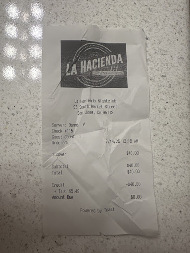 I came to Hacienda Nightclub in San Jose on 7/18 with a group of friends expecting to have a good time. Before entering, I asked the security guard if there was a cover charge, and she confirmed it was $10 per person. I proceeded to pay $40 for four of my friends at the reception area. However, when the server, Danna V, charged me, I noticed something was off. She had the screen facing away from me, and it ended up charging me $45.49 instead.