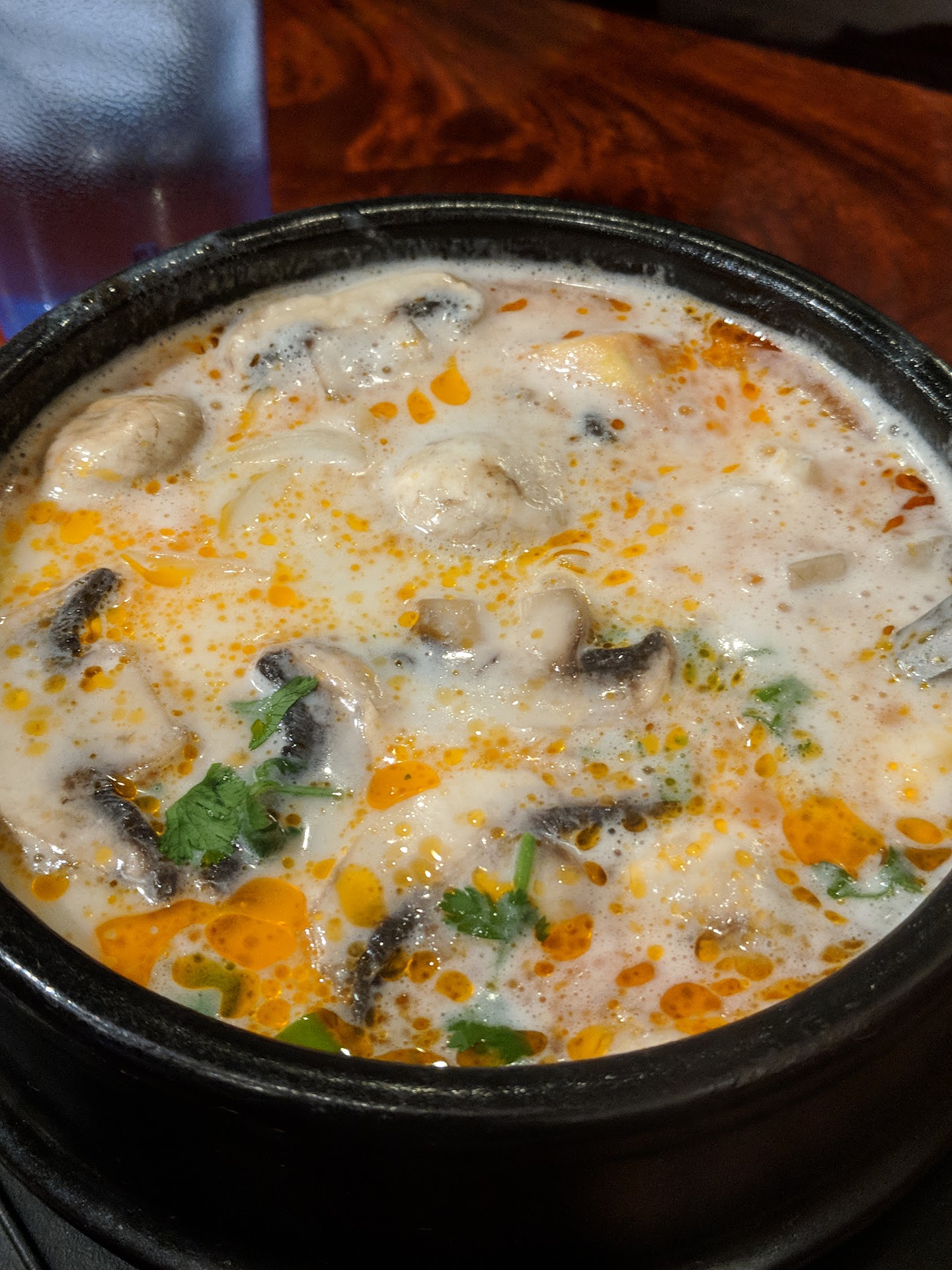 *The tom ka was much sweeter than anywhere else I've had it. It wasn't bad, it was just different. It was decent flavor once we adjusted to the sweetness. The veggies in it were cooked just the right amount to still have a bit of bite, but not require effort to eat. *The pad thais were different. One was thai hot and with shrimp. The texture of the noodles was decent in that one and the heat covered the lack of flavor. *The other pad thai was medium spicy and with tofu. We did have to request that the tofu was fried as they said they normally serve soft tofu in it, so be aware of that if you're a crispier tofu fan. The heat level was on par with what I'd consider mild and the veggies were again cooked just right. The noodles, however, were over soft and soggy feeling and didn't have any bite to them, but worst of all, they didn't have much flavor to them. The thai iced tea was a bit thinner/waterier than most thai tea and it was definitely not at the top of my favorite cups of thai tea list, but wasn't horrible, however for $4.50 for a tapered and therefor smaller than it appears container or $5.50 without ice, its taste was not in line with its price.
