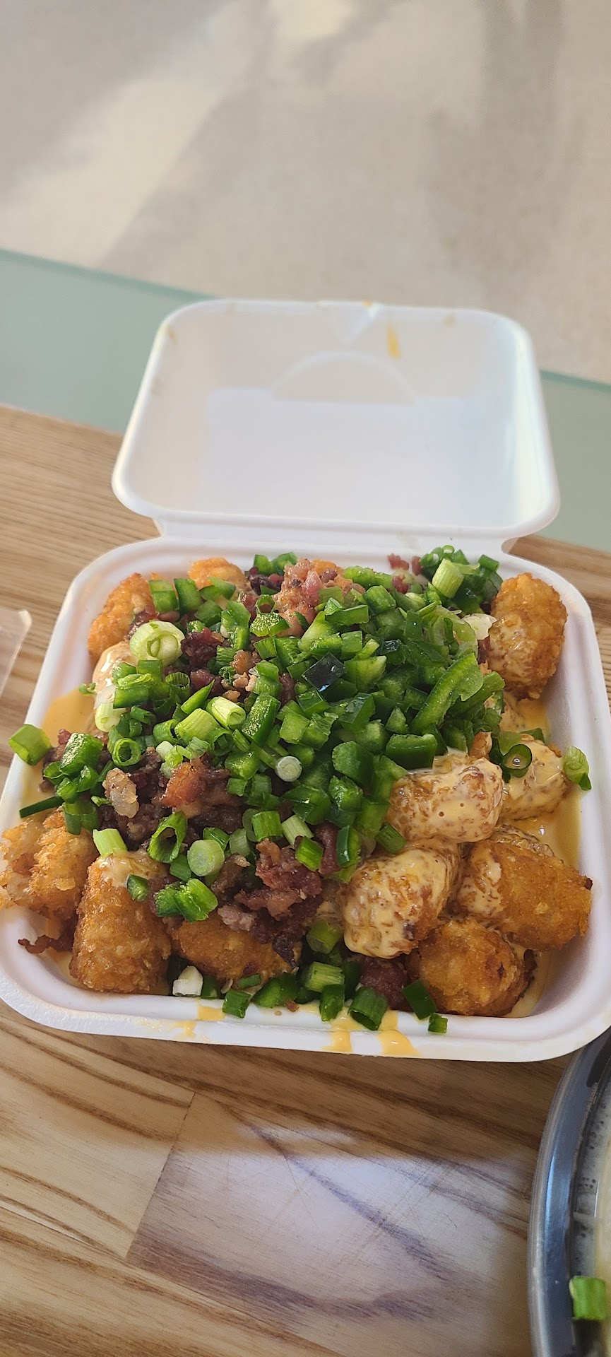 Read moreI decided to eat here prior to my flight. They were very short handed and the guy taking orders was also prepping food in the back. My food rolled out of their rolling oven and literally sat there for 10 minutes. I ordered the green chili chicken Mac and cheese with an order of loaded tots and specifically asked for "No onions". The guy who was multi tasking cooking food and running the register said: "The tots don't come with onions" "not even our loaded tots come with onions". Even though the menu said they did, I took his word for it. I've attached a pic of my loaded Mac and cheese with no onions. I didn't take them back because I feared it would take another 10 minutes to remake them. The food was blah! The tots were good, minus the onions and then they got soggy really fast. So, if you are ever in Terminal B at the San Jose airport, save your money and eat...