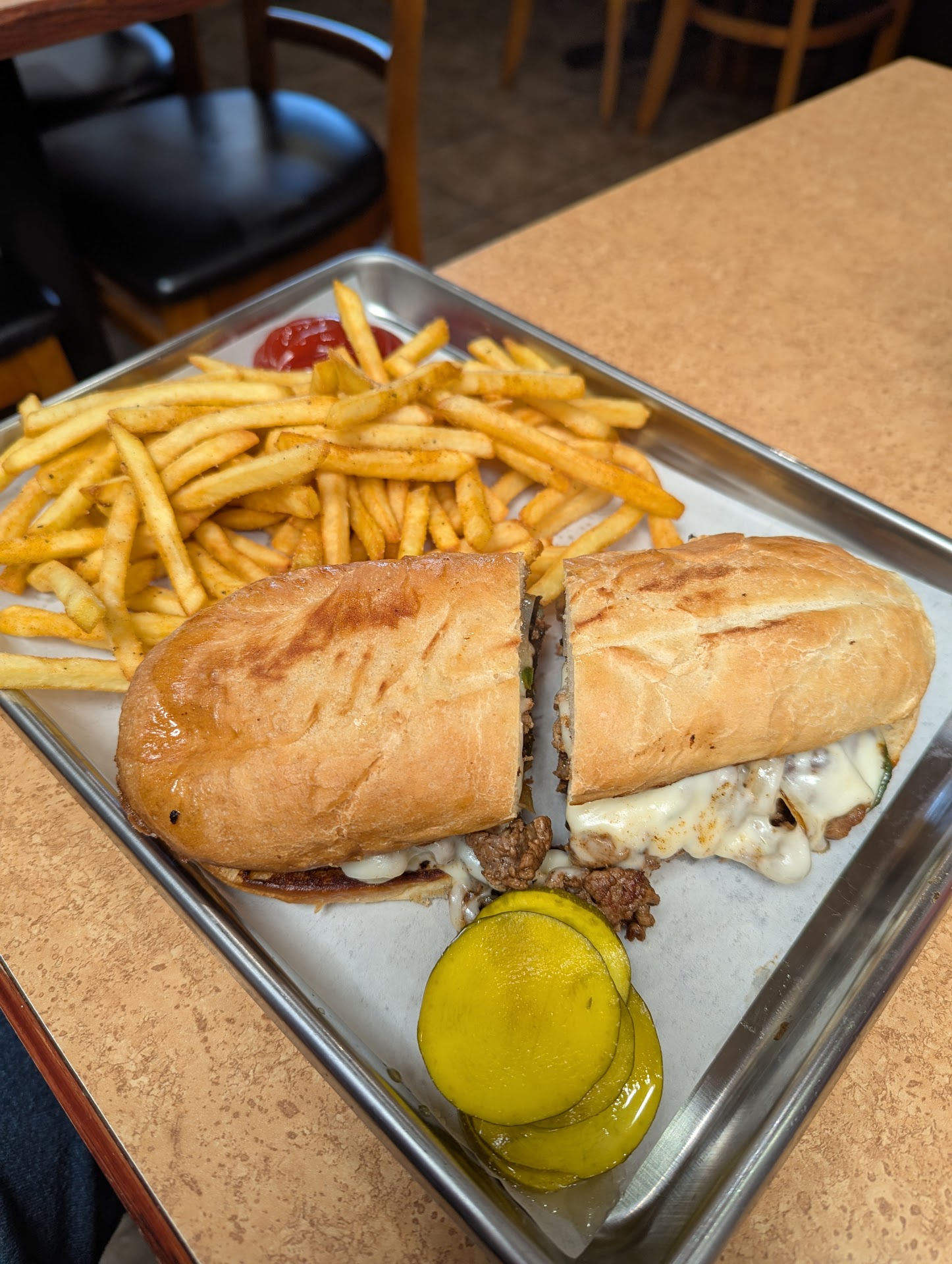 Philly on Fire Steak- This is not your classic Philly Cheesesteak, but a souped up Cali-version; they take Tri-Tip and serve it up with sauteed onions, red bell peppers and jalapeños on a garlic roll and top it with Swiss cheese. It's an ooey gooey meaty, spicy slice of heaven. They also serve up a non-spicy and chicken version (spicy and non) of this, so there's one to suite everyone's taste. 5*
