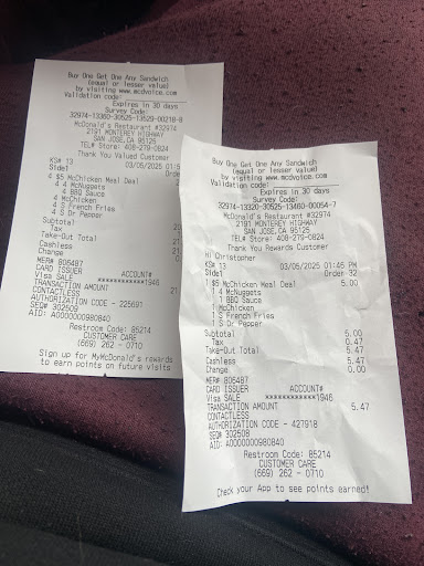 Read moreI would give it a zero i mean seriously i order online and they dont follow the instruction and give me my order wrong. Now i cant eat my order and im stuck looking at it because i cant eat bacon thats the point of order egg mcmuffin with no bacon so that i can eat it, its not my fault the receipt has the instructions that i asked for and when i call to tell them about it no one answers my call. after 5 calls i decided to Call another brach to tell them about it as soon as he heard my order was wrong he hang up. Seriously he hang up and i tried calling him a few times, he just forward me to speed dial or ignored me. What am i supposed to do? Mcdonalds is officially on my blacklist and i hope something is done about this for the other customers because this is my last experience on Mc ever i bet you they wont even care about this review and ignore it just like what most fast food restaurants do. A word of advice to the other get Wendy’s at least they answer their calls and treat you...