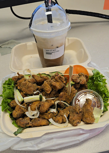 Popcorn Chicken: big servings for $12, it's laid on lettuce and has fresh strings of onions, greens, slice of tomato and slight pepper flakes with sweet & sour sauce. No levels of spiciness but it's just right. Comes with little cute wooden Forks instead of sticks.