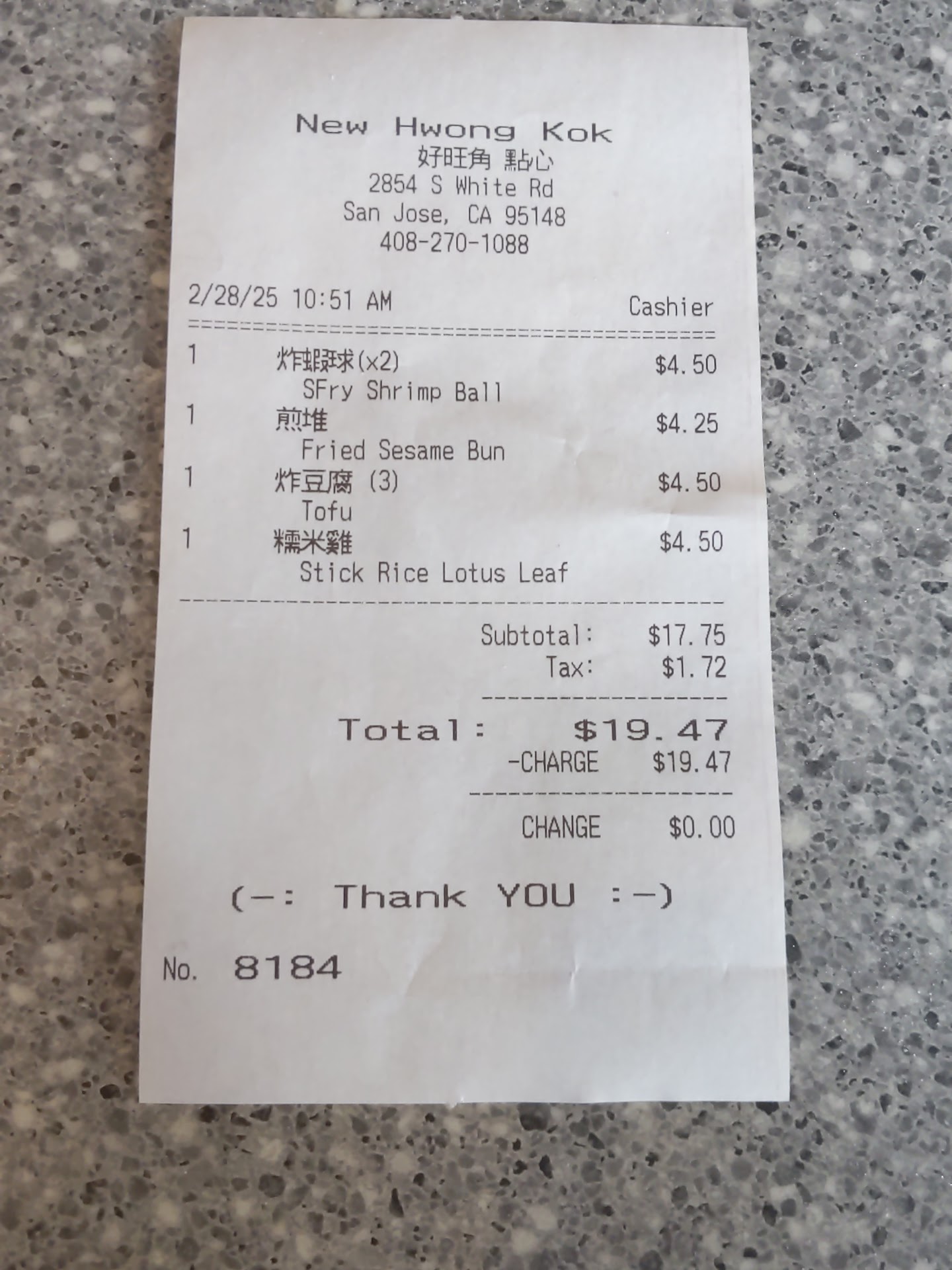 Read moreMy first time to enter this to go/pick up dim sum place. The atmosphere is not warm or welcoming so you can easily see that decor/ atmosphere is not deemed important. Since it is pickup only, I assume this is why no importance is given to looks as customers will not be eating in. I bought: shrimp fry ball( 2 for $4.50), 3 fried sesame balls($4.25), fried shrimp tofu(3 for $4.50), and a sticky rice lotus leaf($4.50). I immediately ate the 2 shrimp fry balls. It was lukewarm but delicious. I couldn't help myself and ate a fried shrimp tofu: delicious. I will eat the sesame balls, sticky rice and 2 shrimp tofu this evening. You might be daunted by the unattractive look and decor of this business but their strength lies in the taste of their food. I'm not a gourmand in dim sum. I'm more of a plebeian taste and this dim sum tastes good. The presentation and lighting in the display counters could be improved so the customer can clearly see what is available and how it looks. You should come at least once so you can taste for yourself whether the dim sum suits...