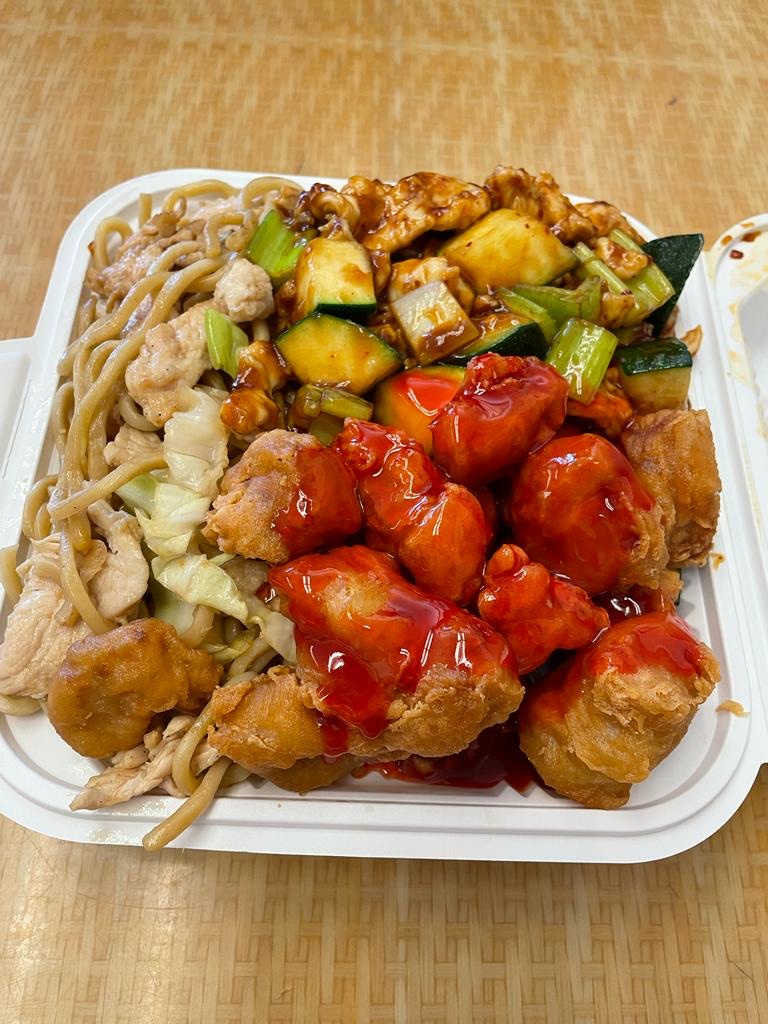 This is a take away place with limited seating, we saw plenty of people coming in for orders they’d placed over the phone and for order they placed in person. The lady at the till was lovely, we did the $11 (without tip) lunch set menu that allows us 3 items (carbs & 2 protein) and shared it between 2 people because we weren’t that hungry. They said 10 minutes but the food came super fast & they gave us paper plates & plastic forks to eat. We also used the bathroom & the lady on the register gave us the key. There was some tissue on the floor & you could see that customers had vandalized parts of the bathroom but it was still cleanish. The lady at the register was the sweetest asking if we needed anything else. The chowmein was just a tad under seasoned and the sweet & sour pork was a bit dry but the kung pao chicken was really good! Portions were...