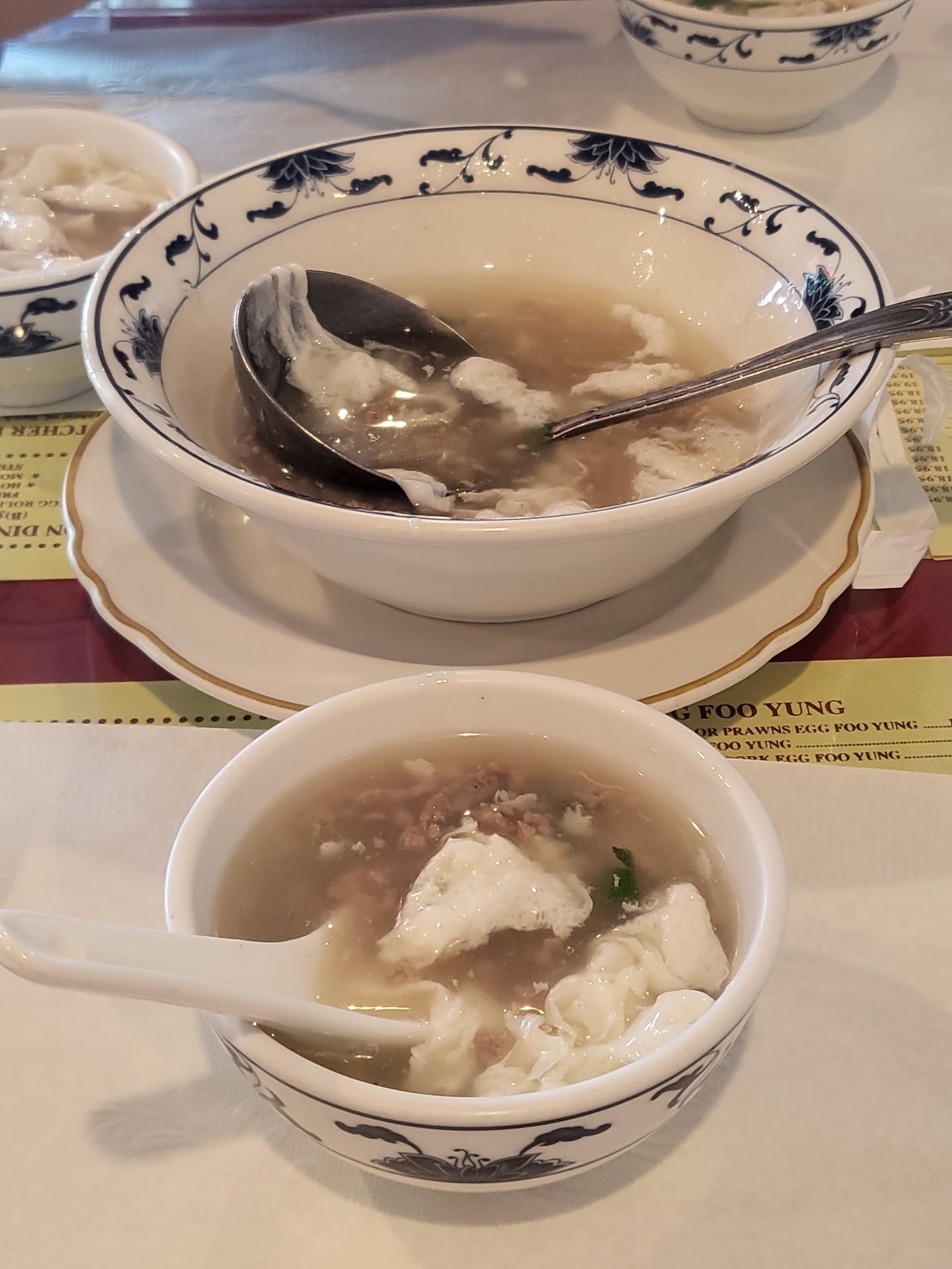 Pictured: pork chow fun + ginger onion beef + pint of minced beef egg white soup