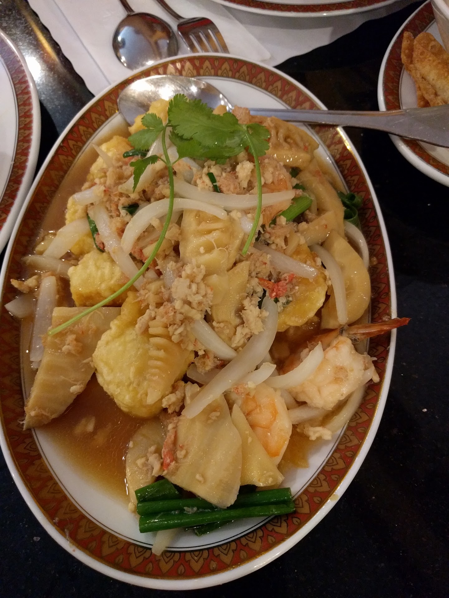 We ordered the stuffed chicken wings ($10.95 I think) as an appetizer, and I ordered the duck curry as a main ($15.95), and my friend ordered the catfish curry. WOW! Everything we had was very very delicious. The stuffed chicken wings were definitely fresh and made to order. The curries were generous in size and meat portion; I might’ve gotten over ten decent chunks of duck, which I didn’t get at this one Thai restaurant on Ocean Ave in SF for the same price (I forget the name of the SF Thai restaurant, but it was also good, just not as good as Krung Thai). My friend’s catfish was very moist and delicious. I asked for spicy, and for me it was just the right amount, where I inhaled two times to calm the burn after a bite, but not much more and not spicy so that the taste was disturbed by all the noise/burn going on in my mouth.