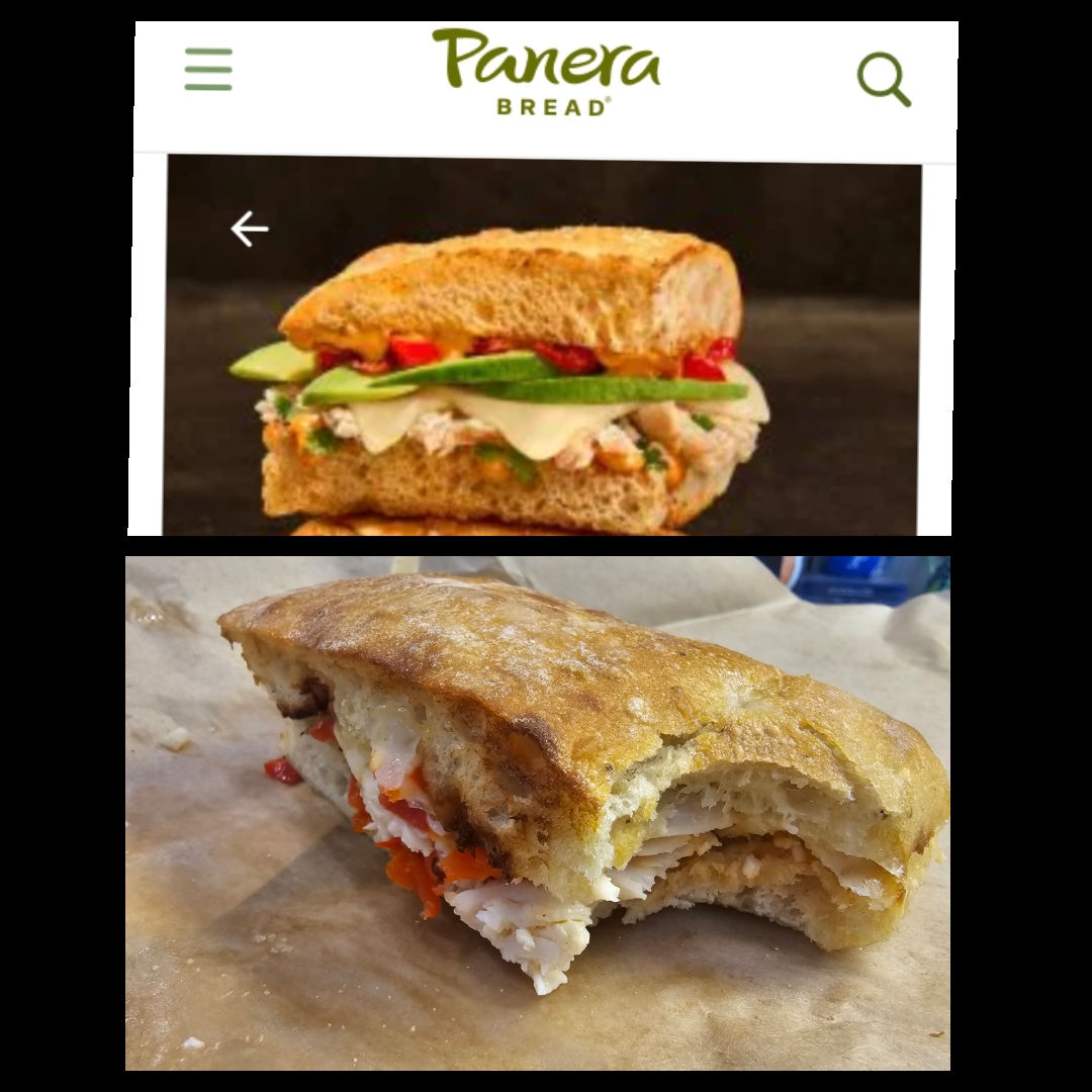 I'm a new Panera convert since they got rid of all the garbage in their food (artificial colors, flavors, etc.). I've been quite pleased my past few times that the food now has flavor, tastes fresh, and their online ordering and pick up system is very easy to use. Today the sandwich missed the mark a little. It had good flavor and was fresh tasting but the presentation is a bit misrepresented from the website to reality. The salad looks very good and they seem to be very consistent with the salad quality, which is nice. Hopefully, it was just an off day and future sammies will look more like...