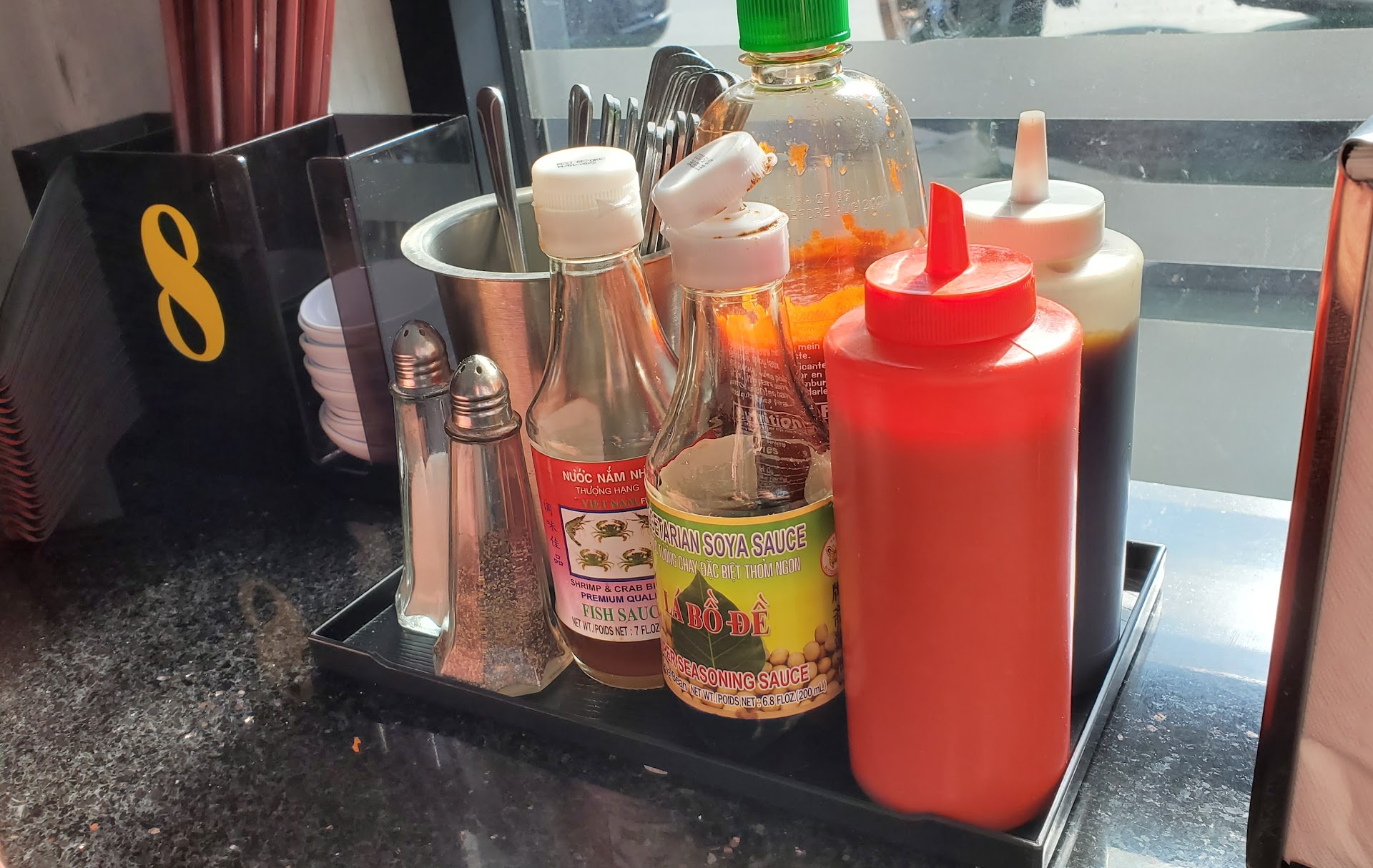 The tea is really good, served in a cup without the teapot, though. I think it's oolong tea. We asked for extra basil and they didn't charge extra. A few times, there was lipstick on the cups and the tables weren't wiped well, so they could be just a little more thorough on cleaning.
