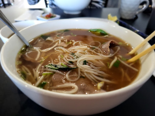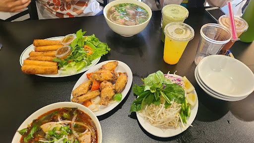 The Bun Bo Hue (spicy beef soup) was very delicious. Clean broth with a little kick of spice. This is probably my favorite Bun Bo Hue. It is fully loaded with beef slices, tendon, slices of minced pork sausage, blood cake, & all. I ordered the regular & it was a very good size portion for me. My friend ordered the pho dac biet which is the pho combo special. She completely finished it and said it was really good. The garlic butter wings were also really good. Crispy & juicy! It tasted so good with a little lemon squeezed on top. We also got to try the fried spring rolls. Also very crispy! You can ask for a side of lettuce/veggies to make a sort of spring roll veggie wrap & dip into fish sauce. Yum! Drinks: we ordered Thai Tea, green Thai tea, & passion fruit lemonade. Other pho restaurants dont sell the best milk tea drinks but this restaurant got it right! The Thai tea was so good. Deep Thai tea flavor & creamy, a crowd favorite. It was our first time ever hearing of green Thai tea & it was also good. It has a floral almost green tea/matcha like flavor. Lighter than the regular Thai milk tea for those wanting something lighter. The passion fruit lemonade was also soooo good. Not too sour or sweet. It was perfect in my opinion & perfectly refreshing. All in all, not only does this restaurant sell great & well cooked food, they have some creative dishes not available at other restaurants of this type. I would definitely come back to try out more of their menu. We had a good experience & I would bring my friends &...