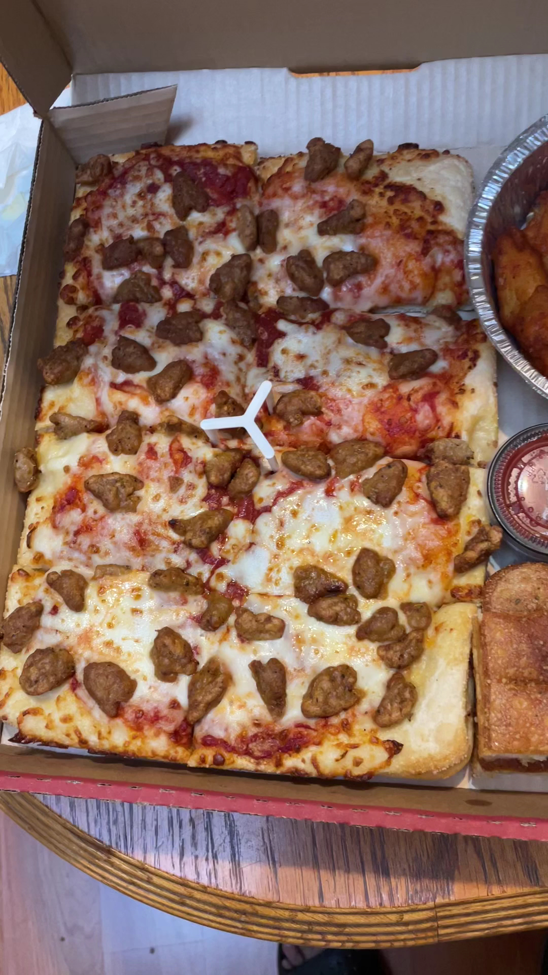 Additionally, the food could've been cooked a little bit longer. The pizza sauce was soupy & the normally light, "buttery", crispy bottom of the pizza dough wasn't there either. That was extremely disappointing! However, the other (impulse) item that I ordered w my pizzas were also undercooked. Those were the 8 pc boneless chicken "wings", I believe is how they were listed. There was NOT a wing in there. Those were chicken nuggets The sizes varied greatly, from large - pretty small. The larger nuggets were about 10 seconds past pink (raw). The meat was white, however, once I bit into them they totally had the raw meat consistency & toughness to them & weren't eaten any further. The medium - small ones were all cooked all the way through though.
