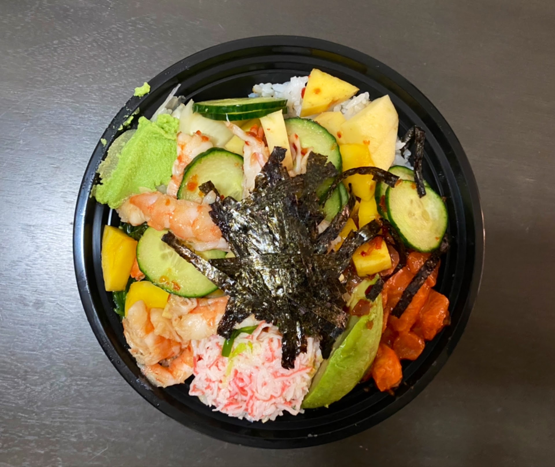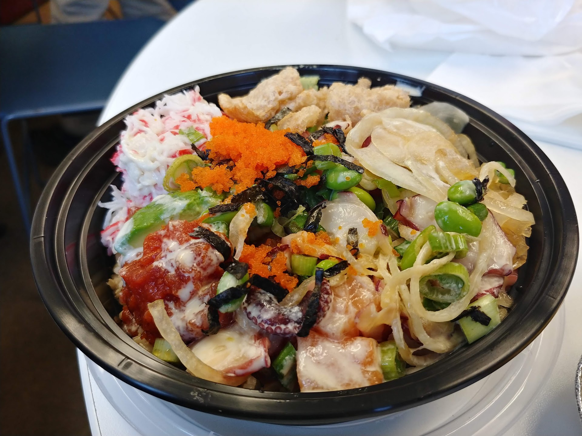 Fortunately, i was home when i ate the poke. I just made my own spicy mayo with siracha, lemon juice, salt and of course mayo. Also, i topped it off with slices of fried pork belly.