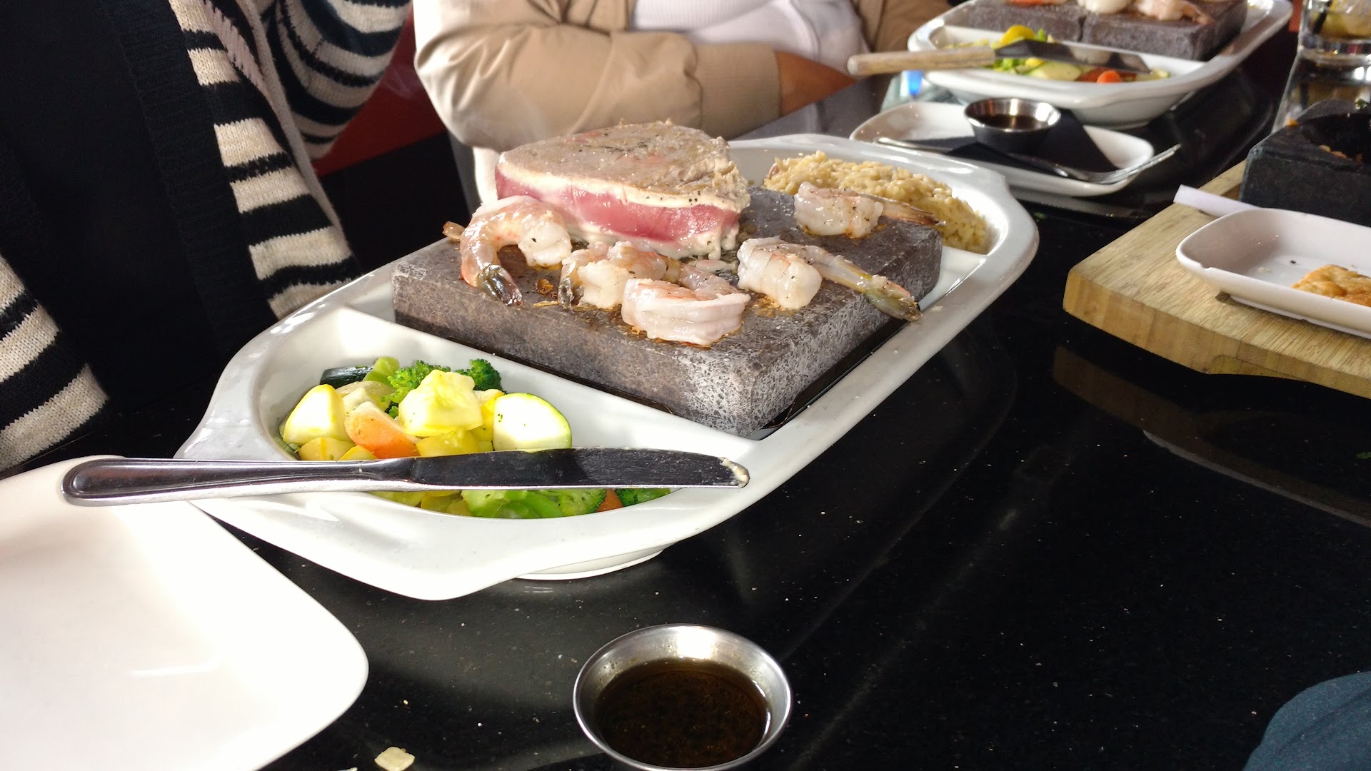 Since we got a large appetizer we split an 8oz Rok filet with French fries and green beans. The French fries came out really cold and looked like they had been sitting out for a long time. We asked for new ones and they were freshly cooked, but a little underdone. The green beans were very garlicky (if you like garlic you will like these). The rok method for cooking was very novel. You start with a raw piece of meat and get to cook it how you like. The meat was super juicy and had great flavor. However at any of these cook your own places, I ended up with overdone pieces and I forgot about cooking while in conversation and ended up with some well done piece and had no one to blame.
