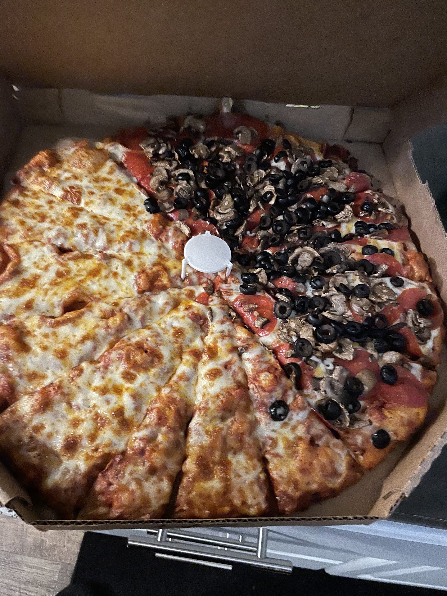Pizzas must've either been undercooked/overcooked or sat too long before delivery because cheese was cold and hard. Overall consistency of the pizza was poor and the slices were either tiny or huge.