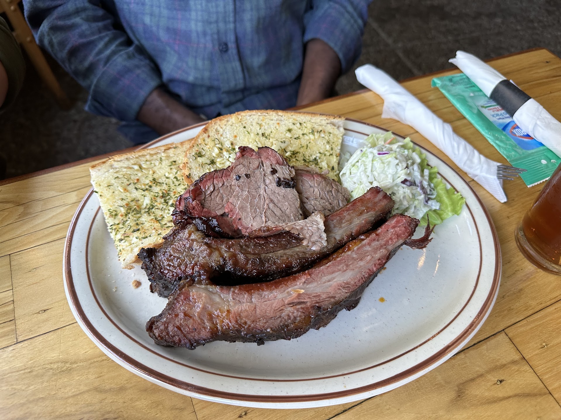 Food: We ordered a full rack of beef ribs along with the sampler plate. We got the meals so our sides were macaroni salad, potato salad and we both also got fries (Not listed as a option on the website). The fries reminded me of frozen fries you heat up along with the potato and macaroni salad reminded me of the grocery store so we really didn't eat much of those. Meat wise The brisket was really great. The pork ribs were ok, the hot link was ok. The Beef ribs were pretty tough to eat, very chewy. The garlic bread was good and they provided a lot of BBQ sauces so that was awesome as well. Personally I might be too picky for BBQ, I really like ribs that are tender and fall off the bone. I think Smoking pig and Famous Dave's have better BBQ but nothing beats my moms ribs yet. Still on the hunt.
