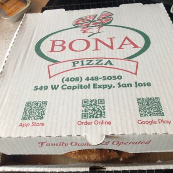 Read more5/2023 I had to Yelp this place out. First time here. I have tried their pizza before at work and needed to come and investigate the facility. In South San Jose Ca. Next time you come around to visit family or friends make sure you stop by and visit this Bona Pizza because it was simply SPLENDID. The half Chicken Pesto and Half Spicy Chicken was mouth watering and very well made. Facility is small and cozy for the quick bite. The parking lot is HUGE. In some big Plaza like surroundings. CVS Pharmacy, Sushi place, Taco Bell and some sweet cakes and pastries merchants around. A big shopping center to handle all of those specific cravings your belly is having.