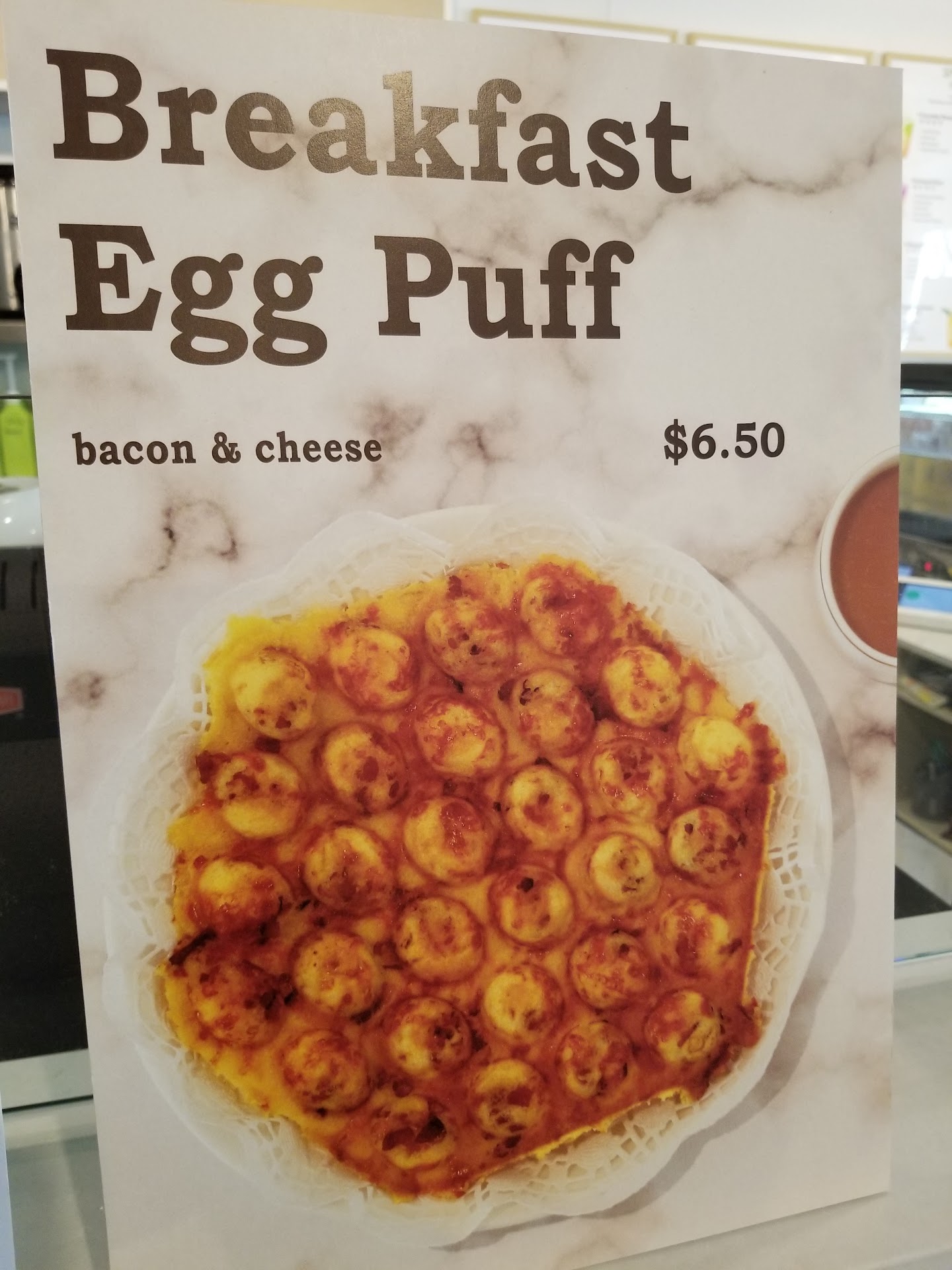 Green Tea Mochi Egg Puff I am a very big fan of matcha and enjoy the strong and bitter taste of tea. However the matcha in the egg puff is not overpowering, but subtle and eases its flavor onto the palate. The sweetness of the egg puff negate any bitterness from the matcha leaving this egg puff very easy to eat.