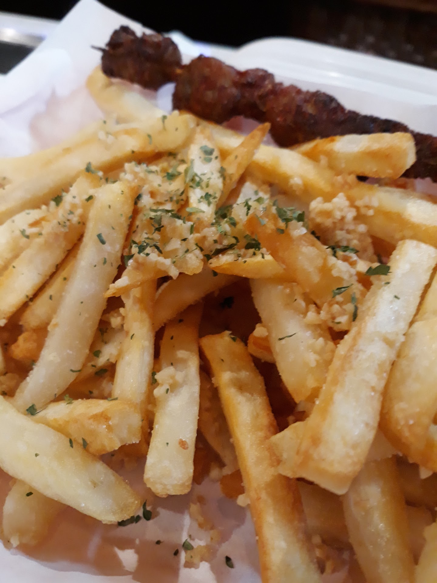 Because parking is such a hassle downtown, patrons will often have to walk past other bars and restaurants to get to the one they want. The garlic fries are great, but IMO, could use a bit more of a tweak, to turn it into a culinary version of a "killer app." See photo: