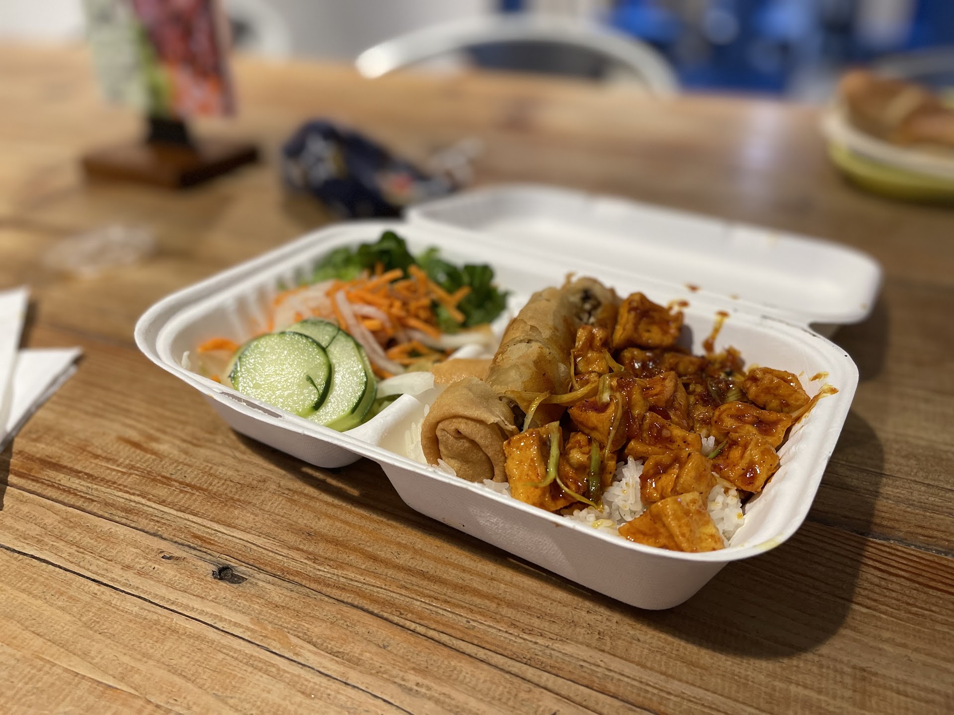 Whether you select take-out or dine-in, you are continuously struggling with the modicum of napkins, utensils, and cups of water given out, and the dining area, while with industrial look and feel including wood, has not been optimized for any sort of group dining or finding seats in a stable manner.