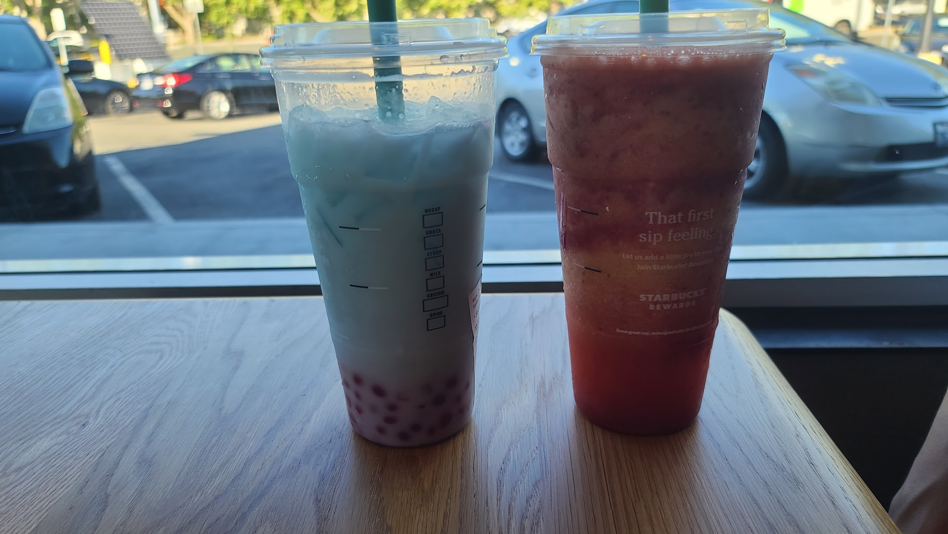 Ā Ā Ā Read moreI tried some summertime drinks and was slightly surprised I didn't like/love either of them. Normally I'm super into sweets but the summer refresher raspberry popping pearls was kinda a kick in the mouth, but coconut version was mild flavor. Got passionfruit/pineapple smoothie amd unfortunately just came back from hawaii (if you know you know) I REALLY liked hawaiian pineapples which made me shaking in tart sipping this drink plus the just pure sugar syrup of passionfruit flavor just made me wonder if I was drinking 70+gas of sugar today. With frozen I guess cold ice it's okay but as soon as it started melting into juice I didn't want it anymore... gonna end up freezing it in ice tray to be an add in for home smoothies. Maybe it's been too long... but even slurpies feel like less sugar. I'll be sticking to the tea/coffee options. PS. I miss the lavender foam Macha tea drink option. PSS these drinks are measured exactly out. I got the light ice option in hopes of getting slightly more coconut milk but they just gave less drink via picture. Looks like I chugged mine but photo is before we drank...