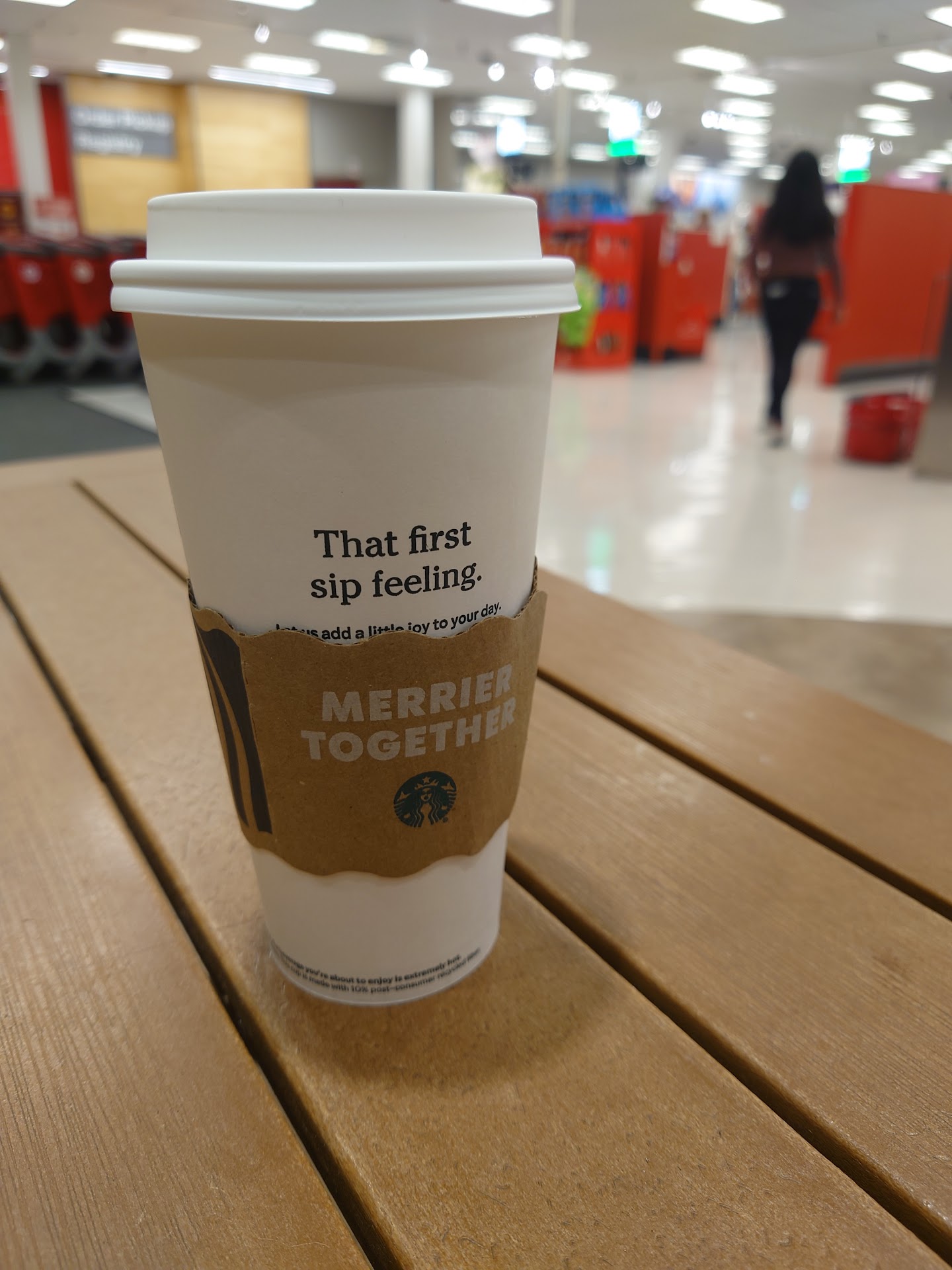 Read moreI went there all the time for on my day off. Most of the time I have great experience. Staffs were nice , happy and give us a good service. However, there will be no luck sometimes, yesterday I came for my usual visit, the girl saw me but I can tell like she not even wanted to ask me ,,, few minutes she came and asked what did I want for my order ? ( with her upset , angry face ,,, I don’t know what wrong , I guessed she just have a bad day !!! I would like my coffee to make like that alllll the time so of course, I know how much I would pay but she end up with $1 more than I used to pay ,, I asked her then she said : the price went up ! Hmmmm $1 not much but if it a mistake or if she charges someone by her feelings then that a lot to me ,,, I end up told her : never mind ,, I ordered online at Starbucks close by and the price still the same I just got my coffee earlier today, the prices not going up !! I still go to Target tho , that my favorite store near where I live and I won’t let that girl to ruin my day ,,, but next time if she serve , I might ask someone else or need to talk...