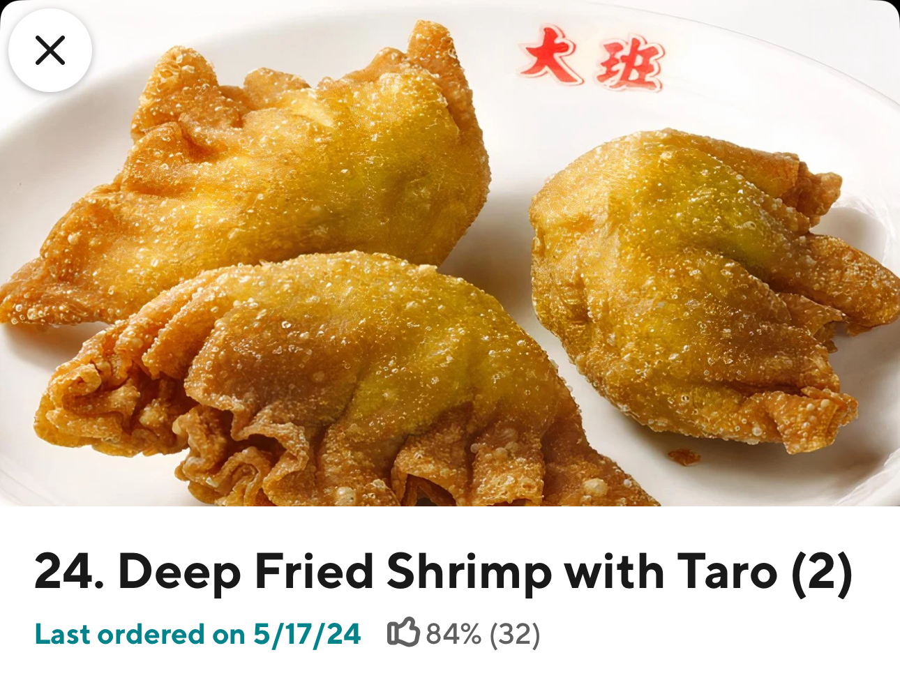 When ordering on DoorDash be aware that the pictures for some of the items will not match. I ordered a fried Shrimp taro and shui mai. The shui mai was good but the supposed ā€œfried shrimp taroā€ was something entirely different. I called in hopes of getting this fixed but they said that it was right and it has pork. Well if it had pork it should have been mentioned. Disappointed since I really wanted what was on the picture. Like this is not the same thing this looks and tasted like something completely different. The shrimp and taro were basically nonexistent. If you order here on DoorDash I think you’d be better off going in person. Basically wasted 20 dollars for them to fumble.