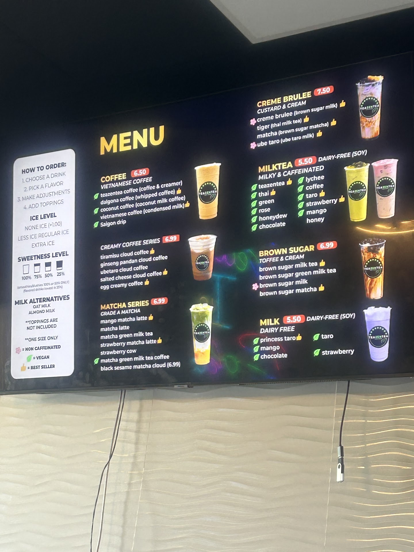 Ā Ā Ā Read moreMy family in Antioch always gets Teazentea in their area, the one day I was in Antioch and my family got boba, they forgot to get my order so Iāve been on a Boba mission ever since. Thank God that they have a Teazentea in San Jose! Im probably going to stop by every time I make a commute South or when Iām heading back North which I do frequently. Smh so upset that my family forgot to order for me that day because Teazentea is bomb! Once I got my order from the San Jose location I fell in love. I would like to order everything they have on the menu if I could, because it all looks good! but the one that I ordered (Mango Matcha Latte), I feel like Iām just going to get the same thing over and over because I liked how it tasted. Canāt wait to make...