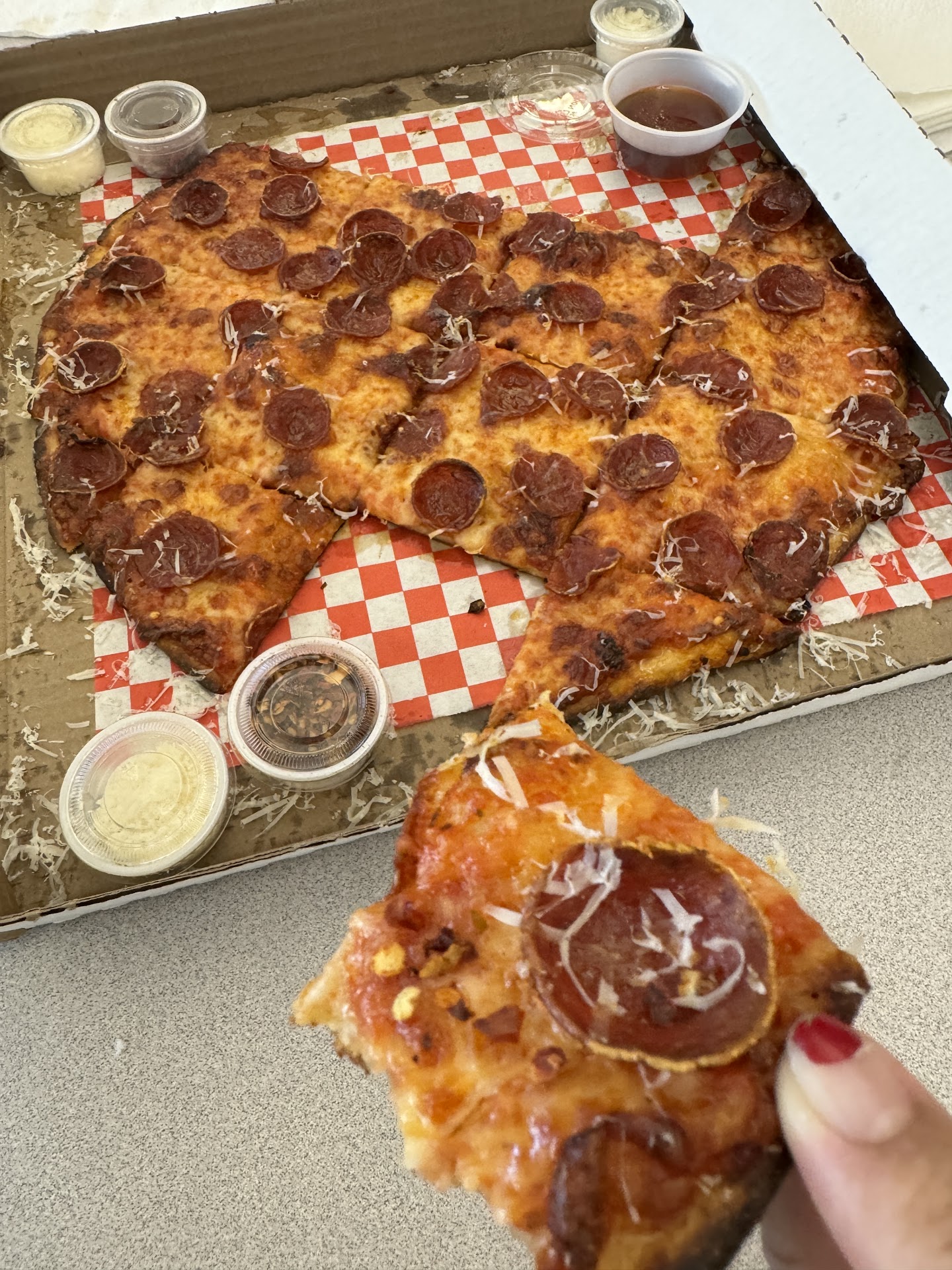 The thin crust was good, and notably, they serve the small pepperoni, the same style as Mountain Mike's. If you're into that style of meat, but prefer a thin crust, I can definitely recommend this place with only one caveat.