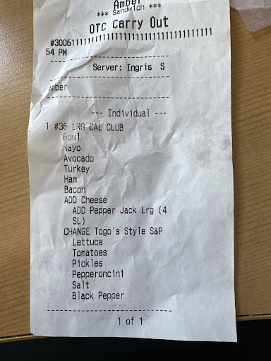 Read moreI ordered avocado on one of the sandwiches, which costs extra. I ordered online and picked up the food, so did not see the sandwiches being made. The avocado was left off. I called to ask for a refund for the avocado and was told they can't do that unless you are there in person. The employee did loom up my order to see that avocado was ordered, but said she couldn't do anything. I am happy that Togo's returned to our neighborhood, but am disappointed with this situation. It was a vegetarian sandwich, so the missing avocado left very little on...