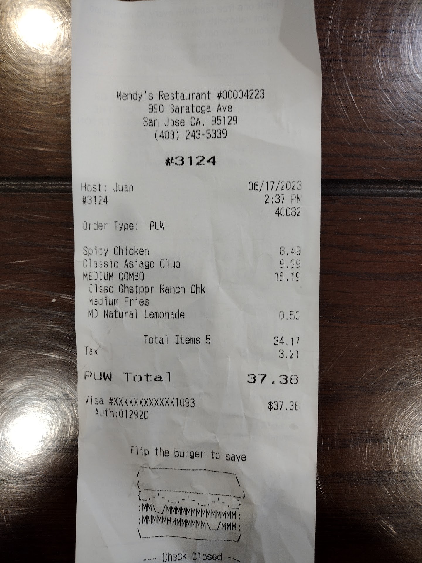 As shown in the receipt, after being very specific that I need one combo and two sandwiches on the side, I was asked multiple times what size of drinks and fries for the two on-the-side sandwiches. When I had to say, "madam, I think you were confused", the host (says Juan on the receipt, but as a customer I cannot tell if the person taking the order and the one delivering the order is the same person, but it's 2: 37 pm on June 17, 2023 and it was a lady with dark skin and glasses on) seemed finally got it and asked me to move on.