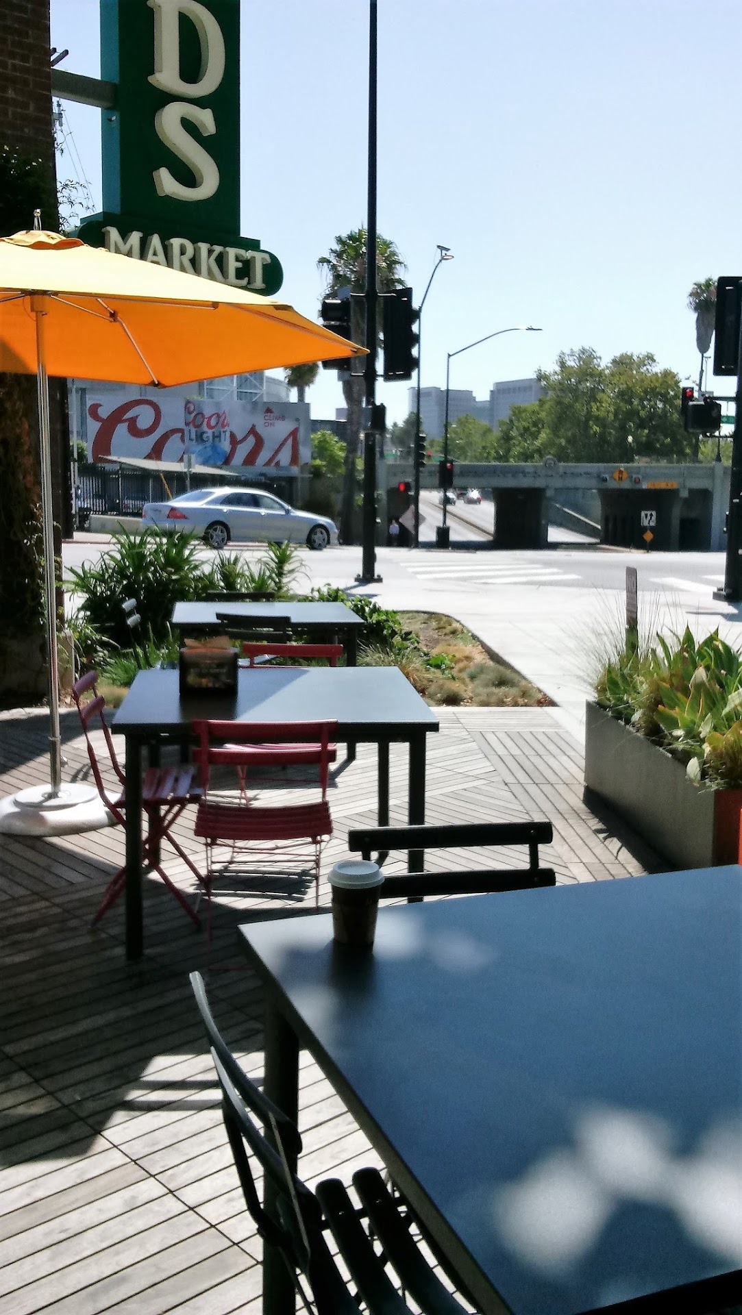 I like the Allegro Roasters in the Whole Foods on Gilman in Berkeley – I think they roast and brew very good coffee. So, having about 45 min to spare at Amtrak in San Jose I decided to nip across Alameda Street to Whole Foods for a pick-me-up. Tons of seating, both sunny and shady; the café / juice bar is small but cheerful; staff members were friendly. I had a batch-brew coffee and then returned two minutes later for a donut. Kind of silly to buy a donut from them for $3 when you can pop into the main WF store ten steps away and pick up something for half the price. Both the coffee and donut were good – would welcome pastries from a local bakery (the Gilman café has pastries from Firebrand bakery in Oakland). They select good beans and roast them well, giving them a lighter roast but not totally blond.
