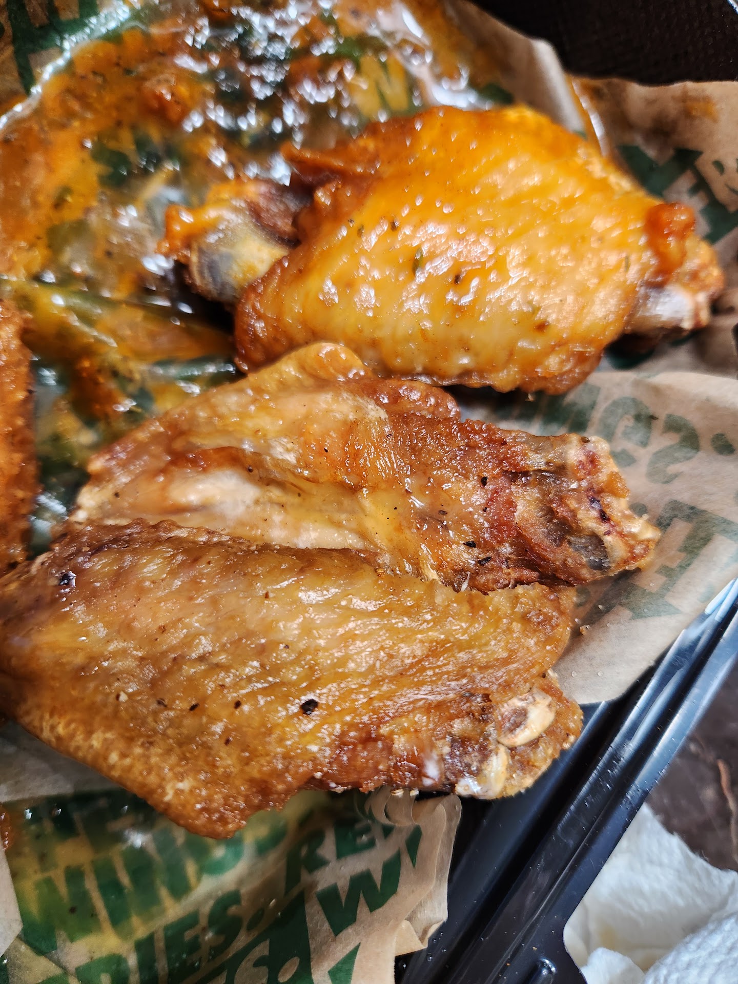 There was almost no seasoning on my order. The first pic is mango habanero and lemon pepper. When I saw the lemon pepper I was so confused because there was almost no seasoning on any of the wings. I thought they mistakenly gave me plain wings until I flipped some of them and saw a tiny sprinkling of the pepper. The mango habanero could’ve been a dry rub, there was almost no sauce. Second pic are fries and hot honey rub wings. The hot honey was again barely seasoned. The fries were underdone, soggy and also under seasoned. Pretty sad overall. If only one wing flavor was under seasoned, I wouldn’t mind. I don’t even really care about the fries because Wingstop’s fries are always a hit or miss. But if my entire chicken order tastes like boiled chicken with a hint of lemon/honey/mango, that tells me that this is likely a persistent issue at this location. Seems like based on the other reviews that under-seasoning is a consistent problem. I’ll be happily driving an extra ten minutes to other Wingstops for...