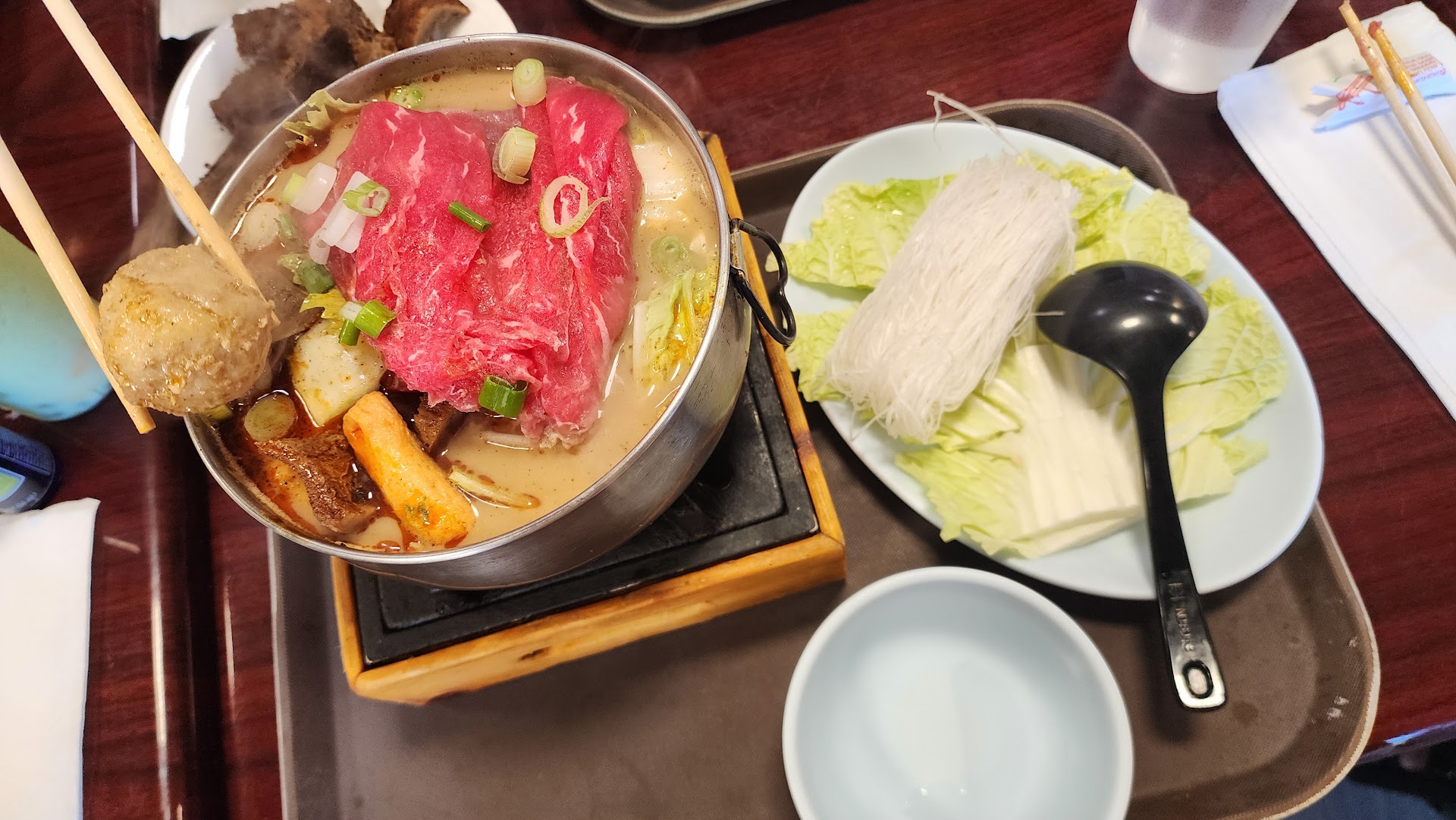 Value / Food - 1/5 $14.50 for a beef hot pot but a very stingy portion. 5 slices of meat, 2 cubes of tofu, 2 fish cake balls, 2 shrimps, and a lot of lettuce. There are plenty of hot pot places (tasty pot, HIT) that offers a lot more for $10-11. Menu items go from $13.50 - $17.50 depending on what sort of meat you want (pork, beef, shrimp). The soup was actually decent. Light flavor but it makes it a nice soup to drink at the end of your meal.