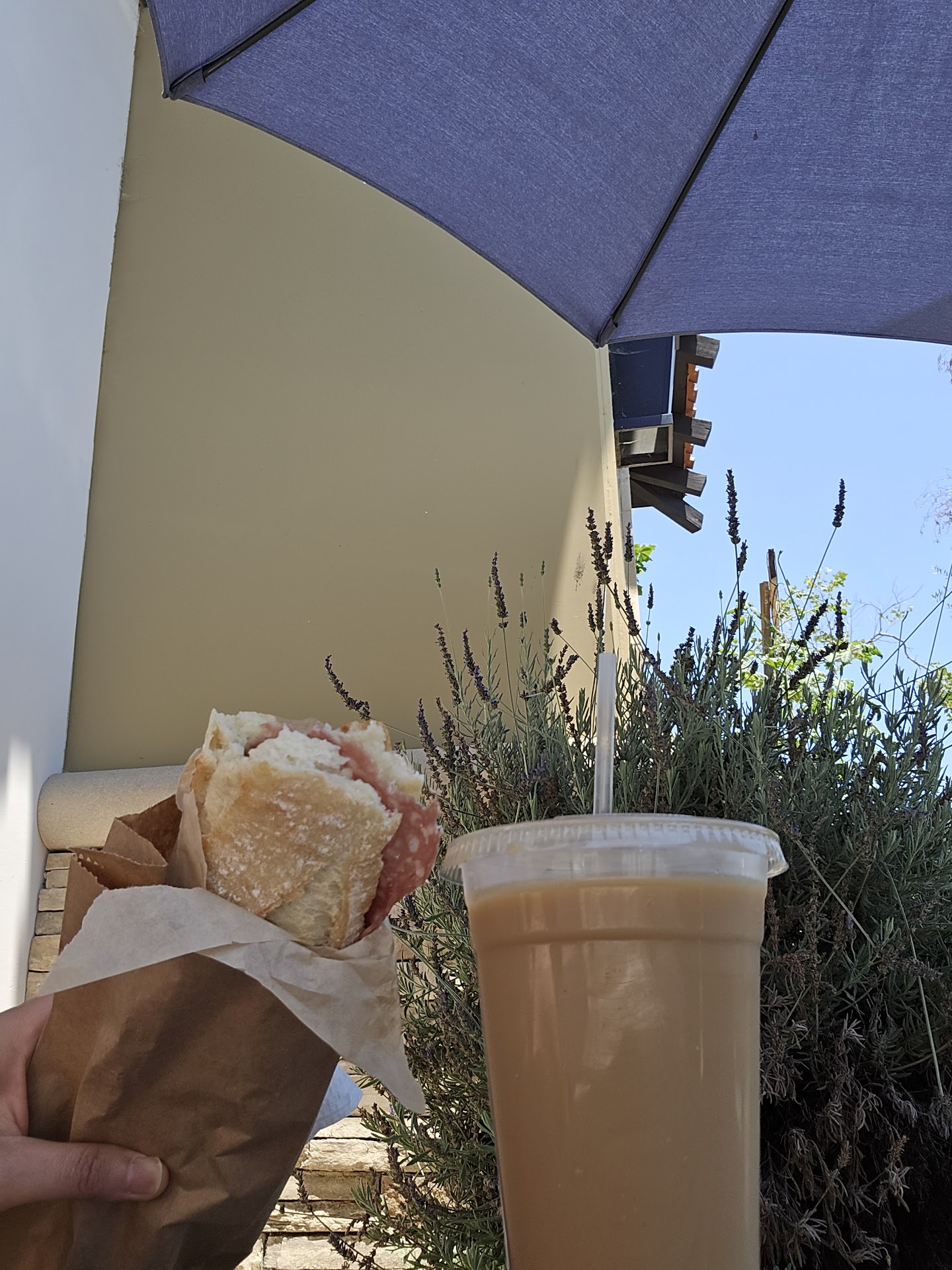 Read moreI'm beyond happy I was in the area to find this French cafe! I'm always looking for quaint cafe vibe, and this was it. Tucked away in an assuming business plaza, I had a salami baguette and an iced lavender latte, sub almond milk, under a patio set up in the front of the building. The salami baguette (thank you other reviews!) was about the size of my forearm, seemed simple but so delicious. I'm salivating a little thinking about it now. The baguette was perfectly crisp with a nice chew and the salami and cornichon a very flavorful combo. I asked about the sweetness level of the latte, which delivered to my surprise just how I prefer, only slightly sweetened. Plenty of parking, service was great, and I'm already planning on bringing my husband to try some of their other items.