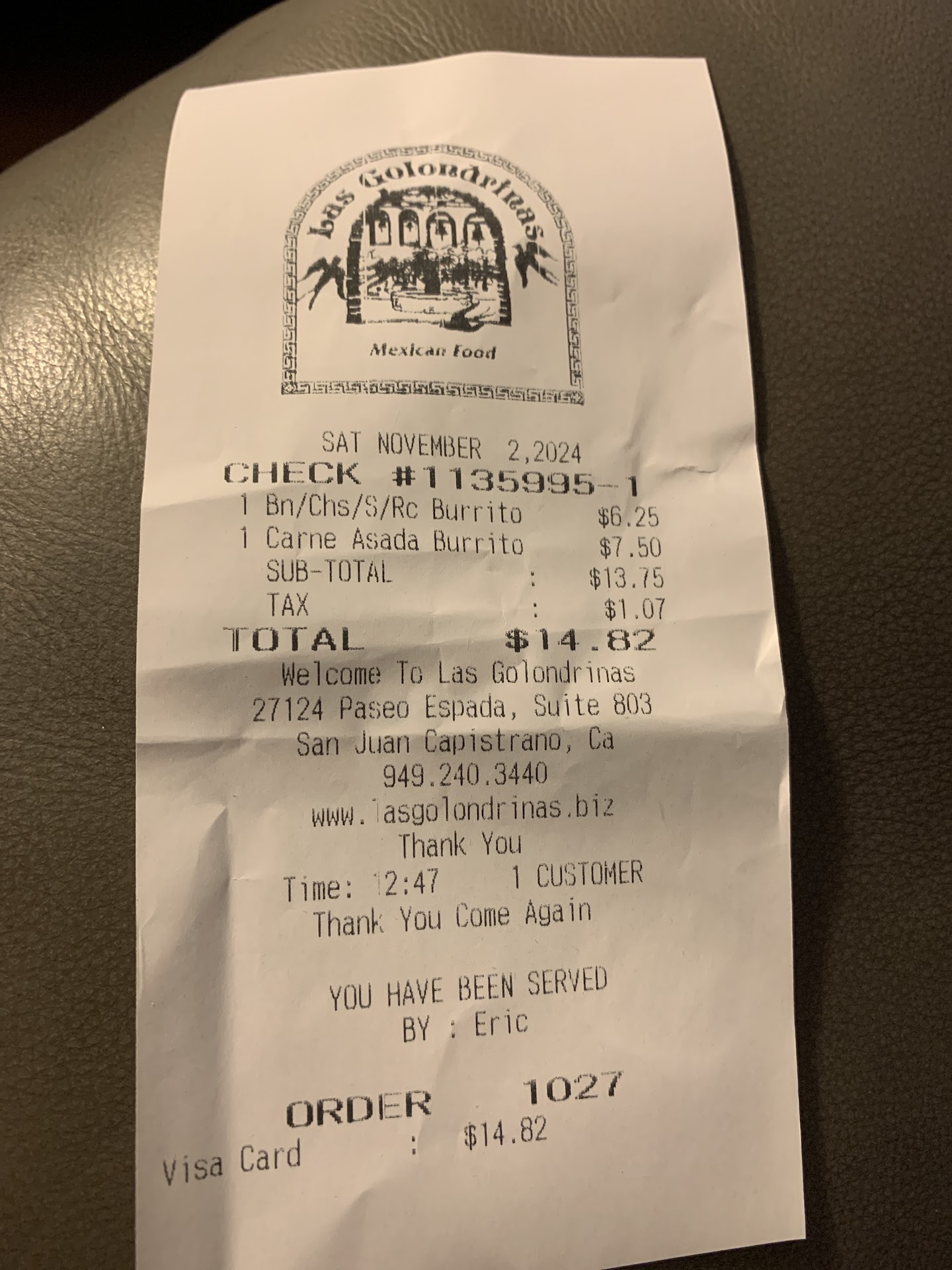 Golondrinas are these cute birds that go chirp chirp, nice little birds, but Las Golondrinas Mexican Food are out to get the palate less lemmings that crowd their counters without fail. Why so harsh, you may ask? I will explain: Went there for Taco Tuesday at the suggestion of a very bad advice from a member of our family. Mentions of outstanding tacos for a $1, filled with meats, made it sound oh so good! We do not reside in the area, were passing through for other business, so I decided to stop and order the tacos. I ordered 10 Carne Asada and 5 Carnitas, waited for about 12 minutes, and since I had requested the order be made to go, I saw as the aluminum foil wrapped tacos were diligently put into a brown bag. Asked for salsa, was told it was extra. Also, tacos were $1.60 not $1, prices had evidently shot upwards. Upon arriving to our home we opened the tacos ready to enjoy them. To my surprise the tacos had about 70% beans. Who, in his sane mind, would order tacos made out of beans? Most places served the meat of choice with salsa, and there you go. The reason they fill their tacos with beans is very simple: less meat. The quality of the tacos was way below par, with steamed double tortillas that frankly, tasted dull. Then again, they had a full staff of about 14 working there, and the crowds kept coming. When I asked how good was the fare I was given the answer of delicious which is a total shock after trying these very crappy bean tacos with a dash of carne asada and carnitas. Well, out of $24 plus? I must urge to anyone of a mind to visit this place to seriously pay attention at their cost cutting ways, and at their expensive menu items, which would be all fine and dandy if this Golondrina was a cut as the birdies with their name, but it is not. Lesson to be learned: not because it is crowded necessarily means it is good, specially in the taco department. I must add that the beans were dried and tasteless. My...