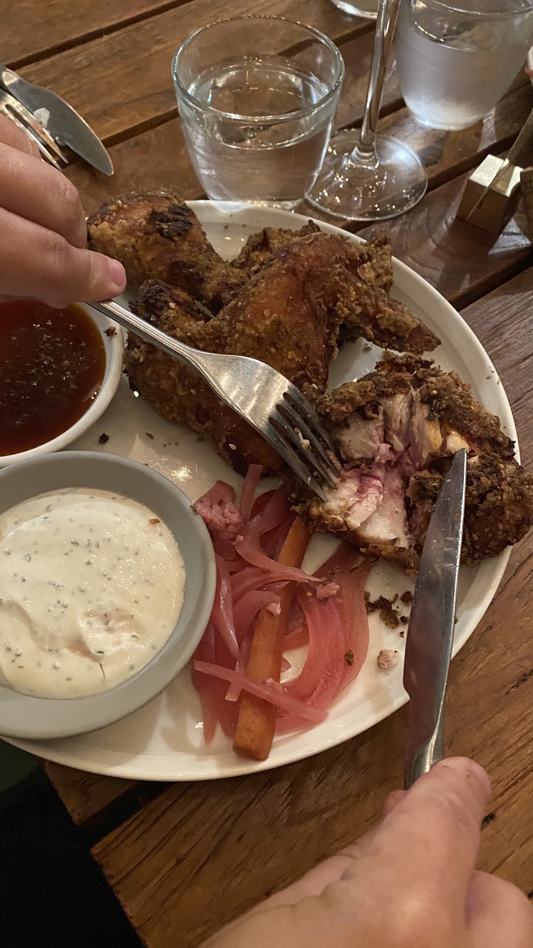 Read moreIn short, this is a place for hipsters not families. The food and presentation are good, but also somewhat lazy. The wait staff put in an effort, but in all the wrong ways. Let me explain. We found this place with the expectations of getting true North African/Mediterranean cuisine. We made a Sunday night reservation, and arrived 15 minutes prior to the 615 reservation . The host made a show of "seeing what she could do." The resturant was empty and the got us a seat soon after our request. The resturant was nice inside, the music was a little loud to have regular conversation, but not over the top. Once we sat down the waitess came to start our order. She was nice, but again very showy, calling us her darlings and her loves. She explained the format for dining as family style (using about 10 more sentences). We were with our two small children (8 and 9 yo) one of whom is vegetarian, and we're told the kids options were fried chicken with cuisecus or fried chicken with fries. Of course nothing was as straight forward in ordering, as you would expect from a hipster resturant. The food came out. It was genuinely good, but the portions were small for the price. Despite waiting over an hour, we did not get one of the items we ordered (chicken). By this time my wife was clearly frustrated and hungry. We asked to just pay for what we received and leave. The waitress was dutiful, but never said anything about the chicken not coming out. She had already included a 20% tip for herself when I went to pay the bill. On the way out, I noted that multiple people who had come in after us were eating the chicken we had waited for so patiently. Needless to say, it was clear that our waitress had forgotten to put in our complete order. We left out of frustration that one of our children didn't have a reasonable option for a vegetarian child, and one person did not gait the main meal. For this reason, I can not recommend...