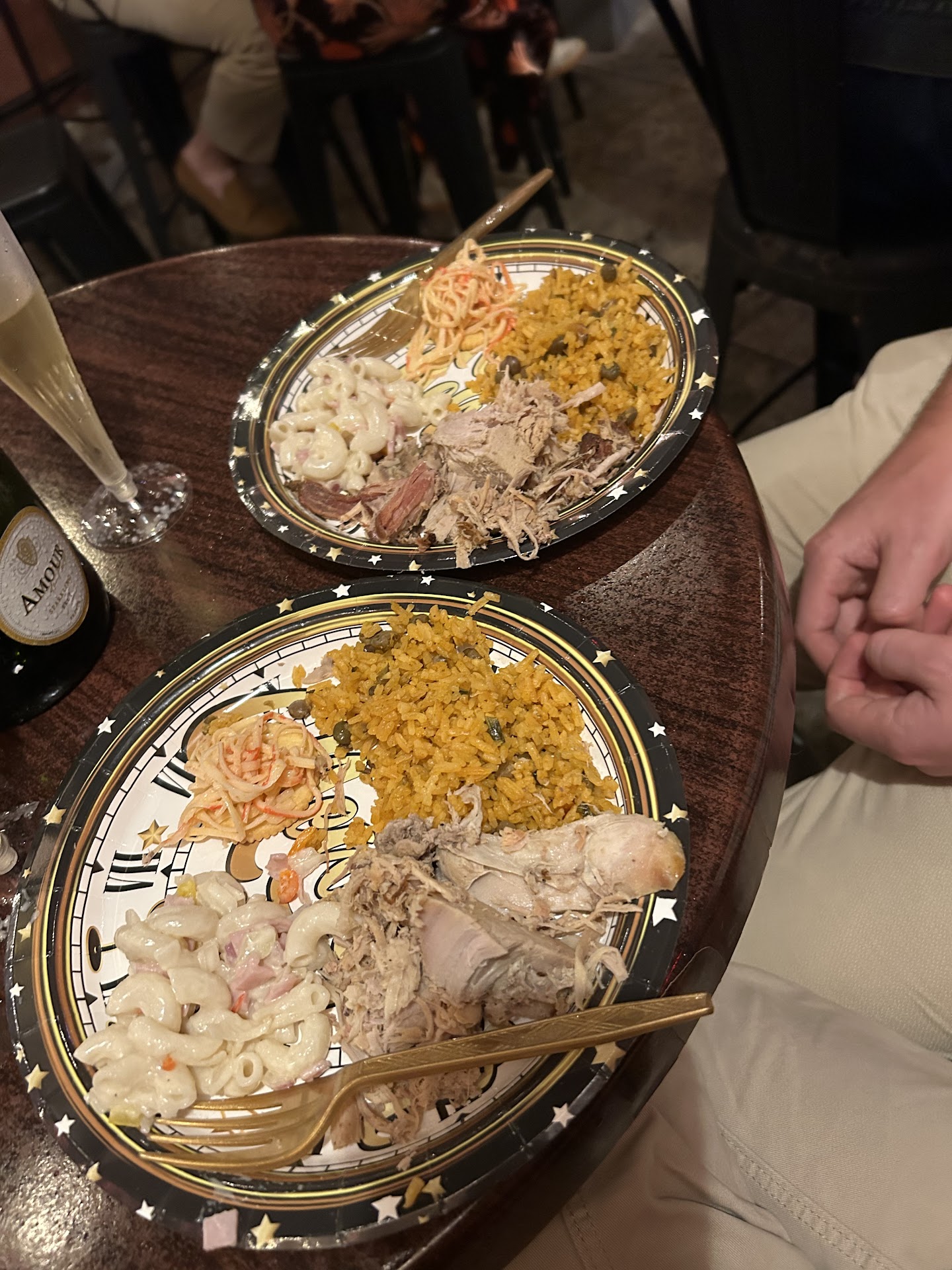 After being seated, we weren’t served anything for over an hour. Around 10 PM, we were finally asked if we wanted the champagne – which came in two plastic cups and was indeed not champagne but cheap sparkling wine. The water we ordered came in bottles without glasses.