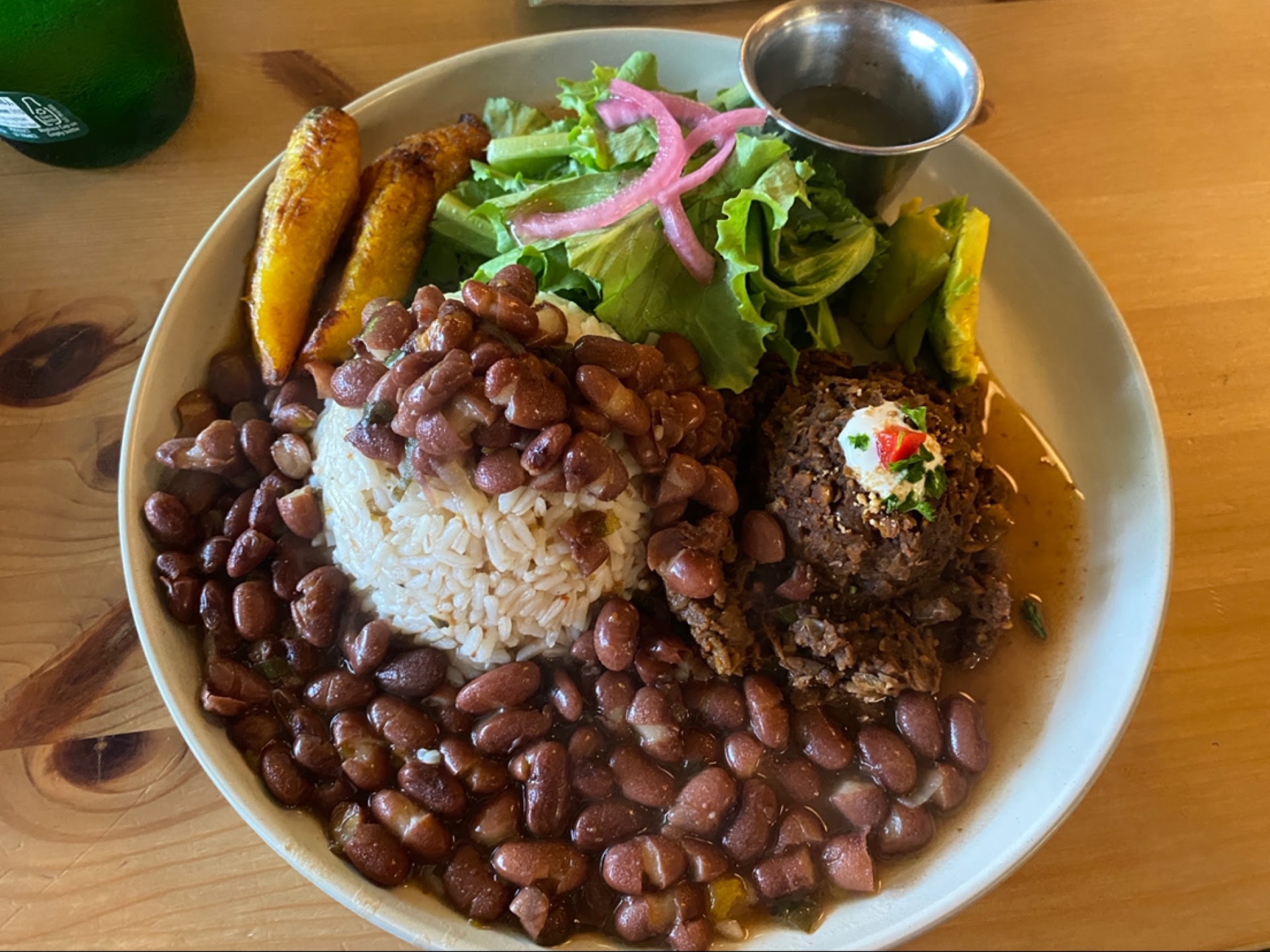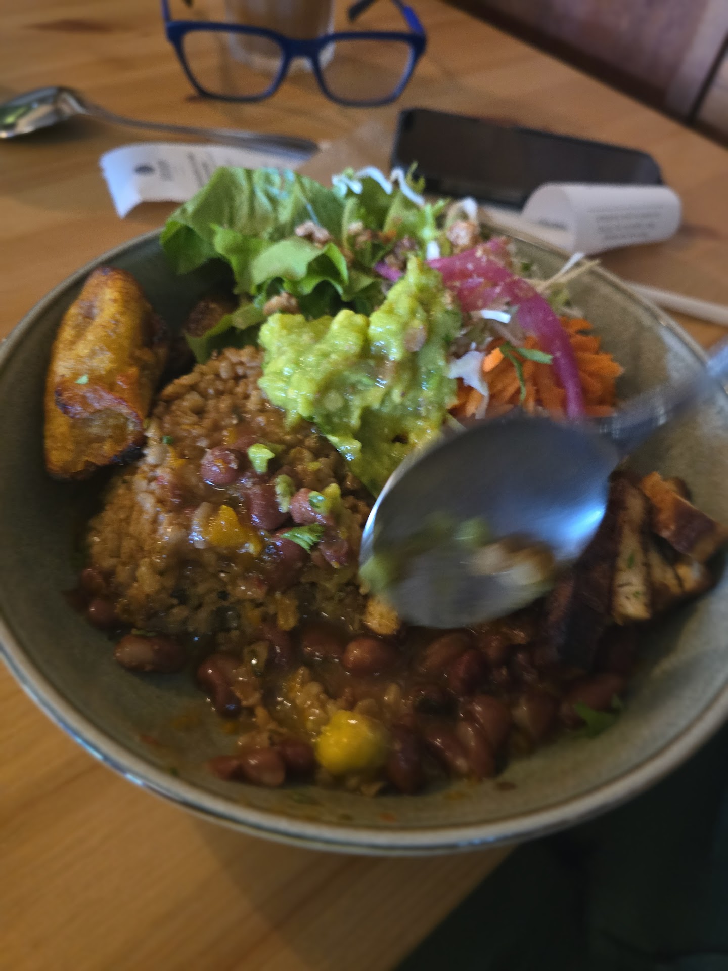 Ambience - both outdoor and indoor are full with greens. Outdoor is a shade with all green boundaries. Item 1: Jibaro bowl- contains wholegrains rice with a choice of protein (seitan vs tofu, I got tofu). Bowl was good, very filling, tofu was well cooked. Lot of carrots though but overall good portion size. Fried plantain was sweet and was tasting almost like sweet tofu.