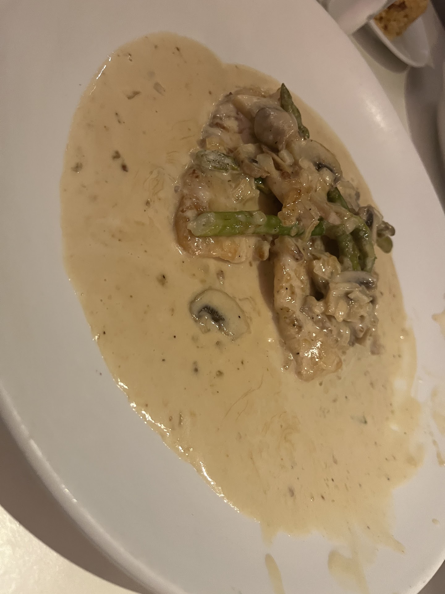 I asked for the chicken a la boscaiola, it had shrooms and asparagus & a delicious brandy sweet sauce.