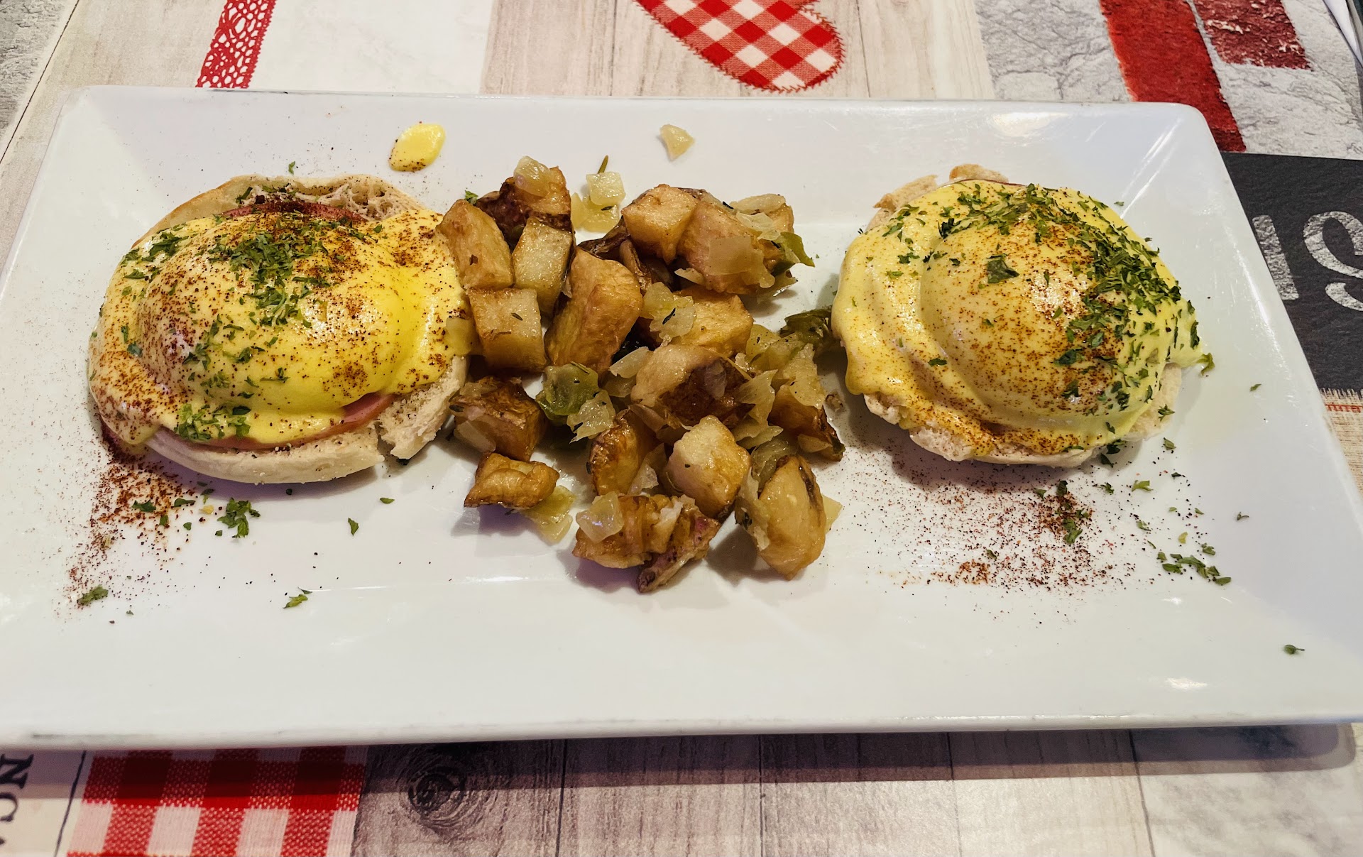 Now let's talk about service. Ha! Just kidding. What service? The food took over ONE HOUR to get to the table. Zero update from the waitress until I specifically asked what was taking so long. The ice on our drinks melted and not once were we offered another drink. The person who had a hot chocolate finished it and she was not even offered a glass of water after .