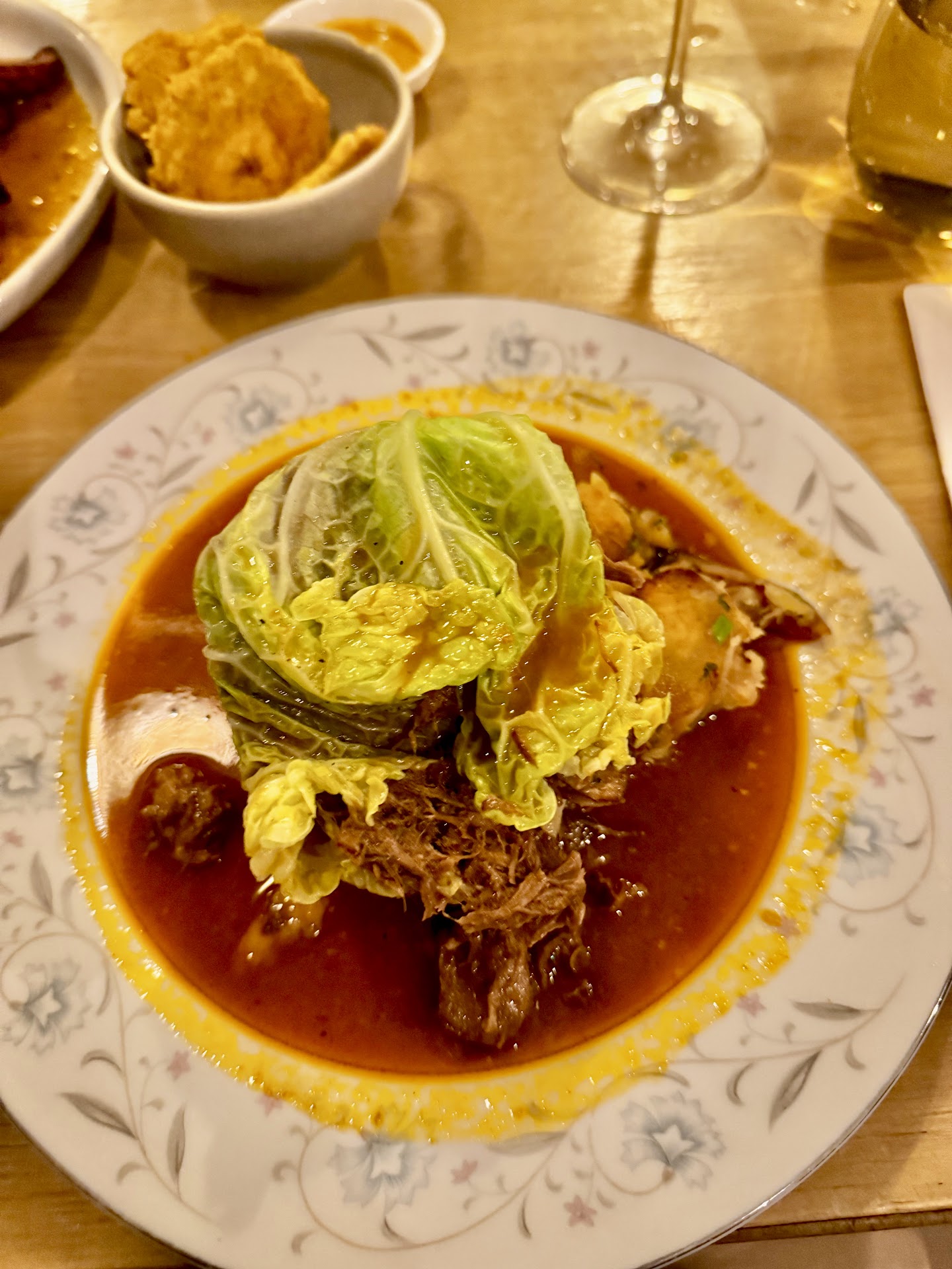 For our meals we had the lamb fricassee and pork shank. The lamb comes wrapped in a cabbage leaf. First appearance and it looks like nothing special. Then you fold back the cabbage and unveil the most perfectly shredded lamb youâve ever eaten. It was so tender and juicy, no strong lamb flavor. Even people who dislike lamb would love this. The broth below had hints of warm spices like cinnamon and maybe a slight hint of star anise. The sweet potato mash was a perfect accompaniment. It had little lumps which I love in mashed potatoes/sweet potatoes. This meal tasted like home cooking if you were dining at a master chefâs home. We also got a side of their plantain tostones. No greasiness, just perfect crisp yet tender plantain. They also salted them well so they werenât bland. We dipped them into the hot sauce and loved them.