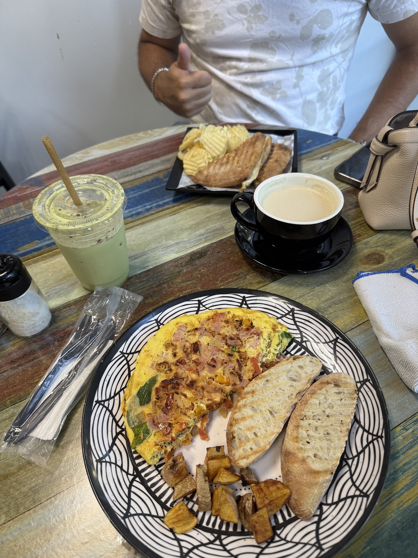 We are a couple from Gurabo and since our kids were on school for MLK holiday we decided to try a new breakfast place. Parking is in the street and seems a bit difficult although we went on a holiday and there was no traffic at all. Got here around 9am and it was empty, ordered omelette with vegetables, egg sandwich and french toast. For drinks we had hot chai and cold matcha. It was served literally just minutes after ordering. ALL of it was extremely delicious and looked amazing. I specifically loved my matcha and the fact that they had ciabatta and a variety of breads to choose from. Spent around 45$ and honestly the quality was superb. The local had some nice american music and a comfy homey style inside. We will definitely try to go back and take our kids. We did not mind but there surely is a high traffic of company dogs...
